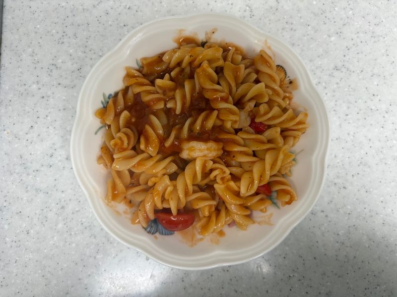 혼자 파스타를 만드는 건 처음이었는데, 레시피대로 따라하니까 정말 간단해서 놀라웠고, 앞으로도 잘 만들 수 있다고 생각했어요. 그리고 저는 집에 푸실리 파스타면밖에 없어서 숏파스타를 만들었습니다! 그리고 평소 해산물 파스타를 좋아해서 집에 있는 냉동 새우랑 방울토마토를 추가했어요.