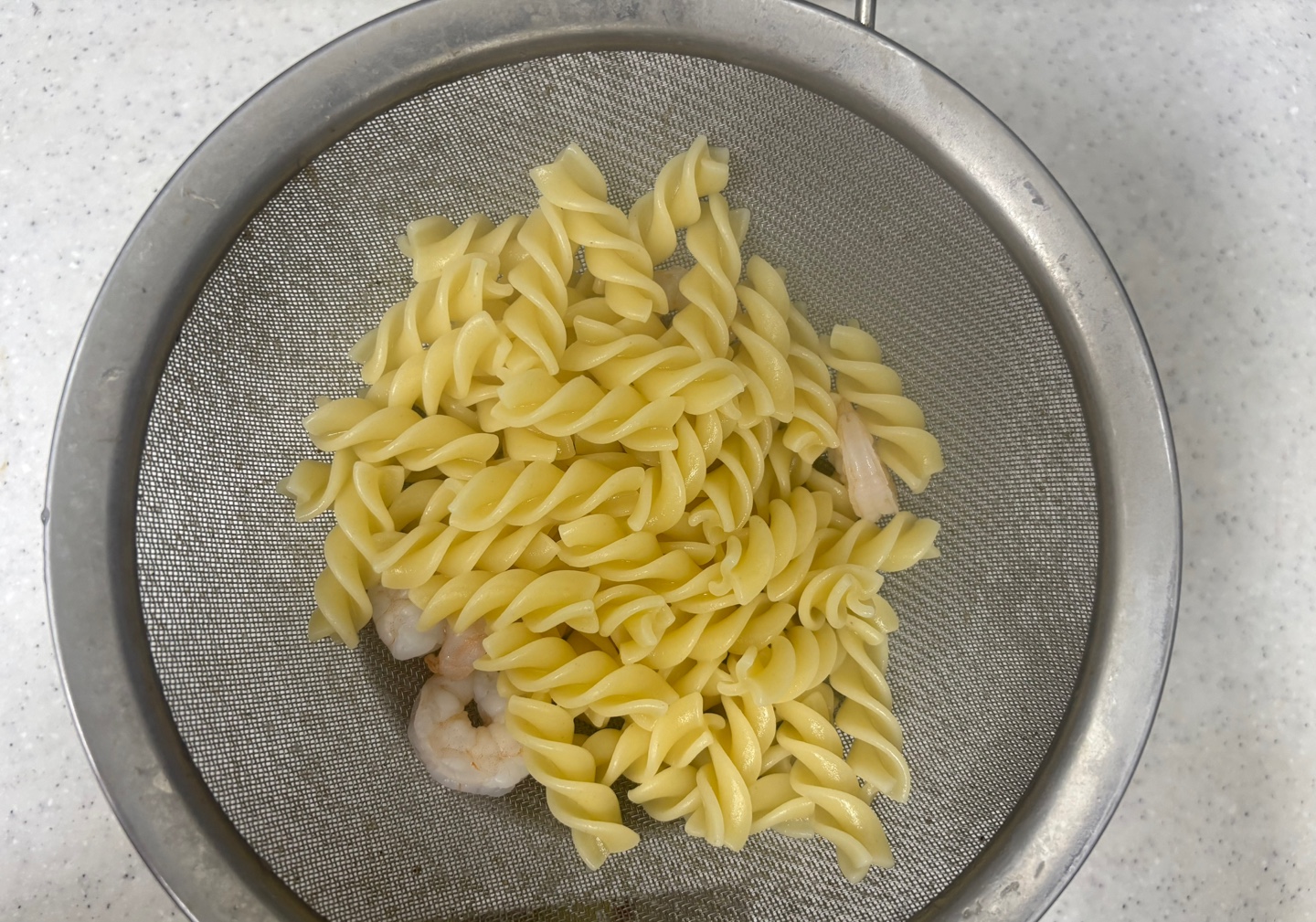 혼자 파스타를 만드는 건 처음이었는데, 레시피대로 따라하니까 정말 간단해서 놀라웠고, 앞으로도 잘 만들 수 있다고 생각했어요. 그리고 저는 집에 푸실리 파스타면밖에 없어서 숏파스타를 만들었습니다! 그리고 평소 해산물 파스타를 좋아해서 집에 있는 냉동 새우랑 방울토마토를 추가했어요.