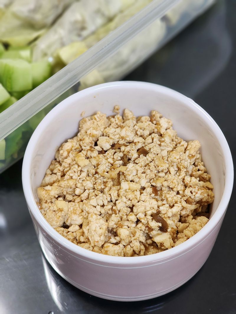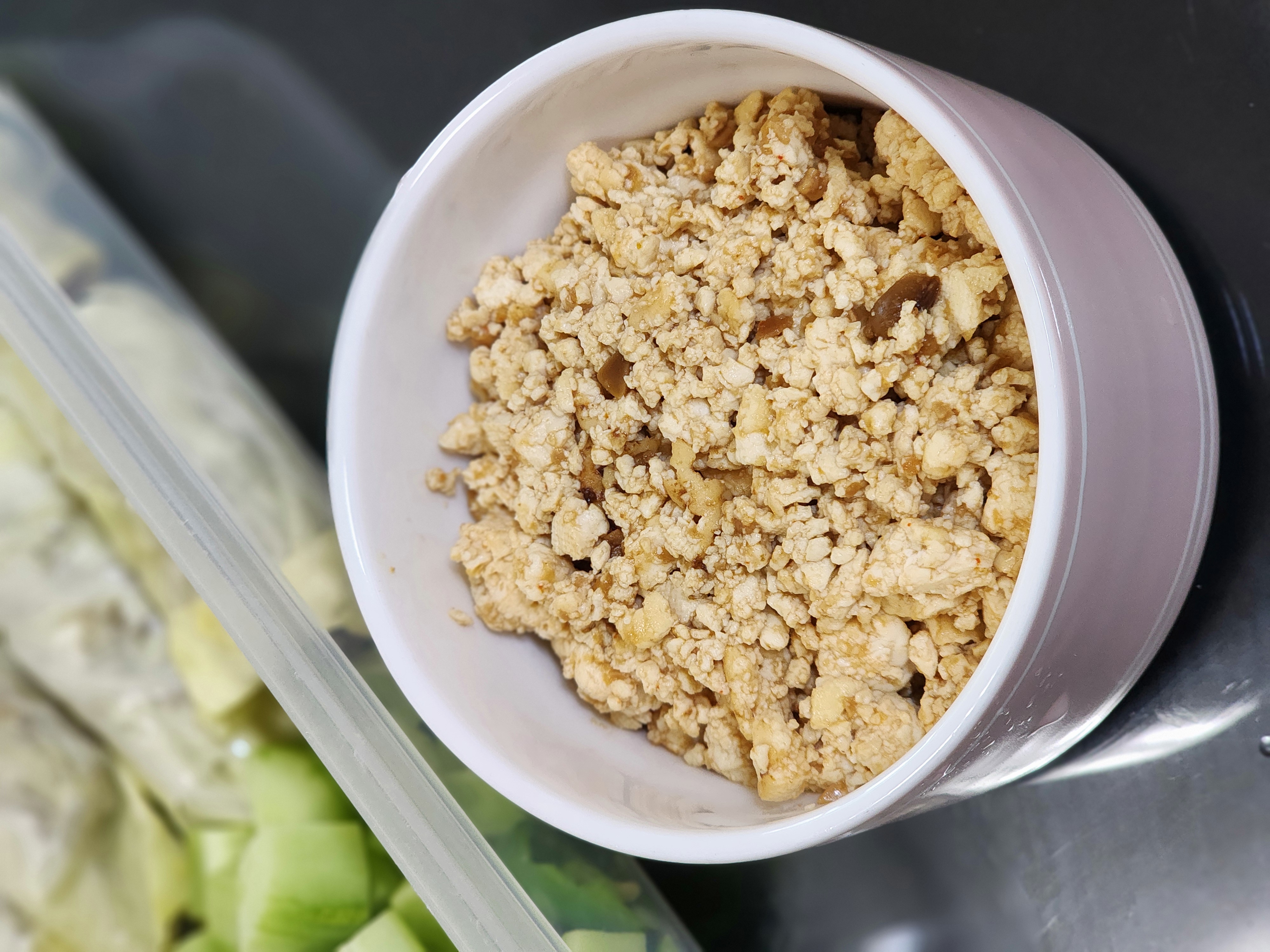 두부는 후라이팬에 올려 잘개 으깬 다음 물기없이 바싹 볶아줍니다.