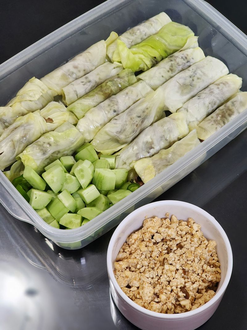 찐 양배추잎에 곡물밥을 넣어 돌돌 말아주고