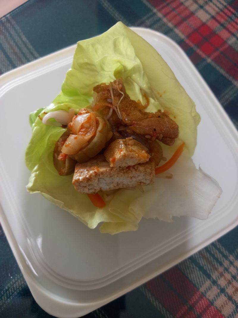 두부 구워서 양념한다음. 고기와 야채와 함께 한입쌈!!! 두부를 넣어 고기의 양을 줄여 먹을수 있어 건강해요. 피크닉 도시락으로 아주 좋아요.