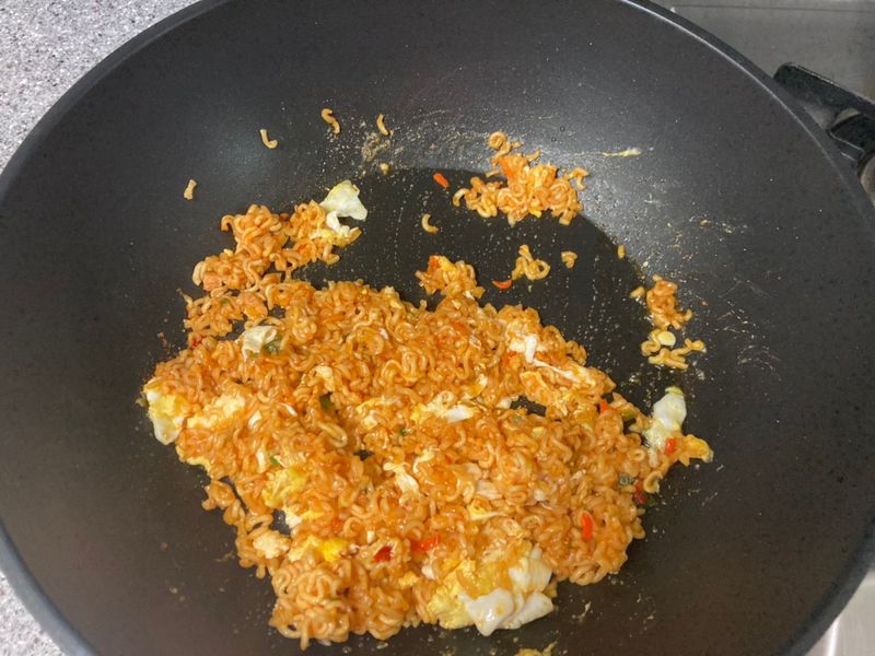 5. 스크램블 하듯 풀면서 라면과 섞고 흰 밥을 넣고 볶아주세요.