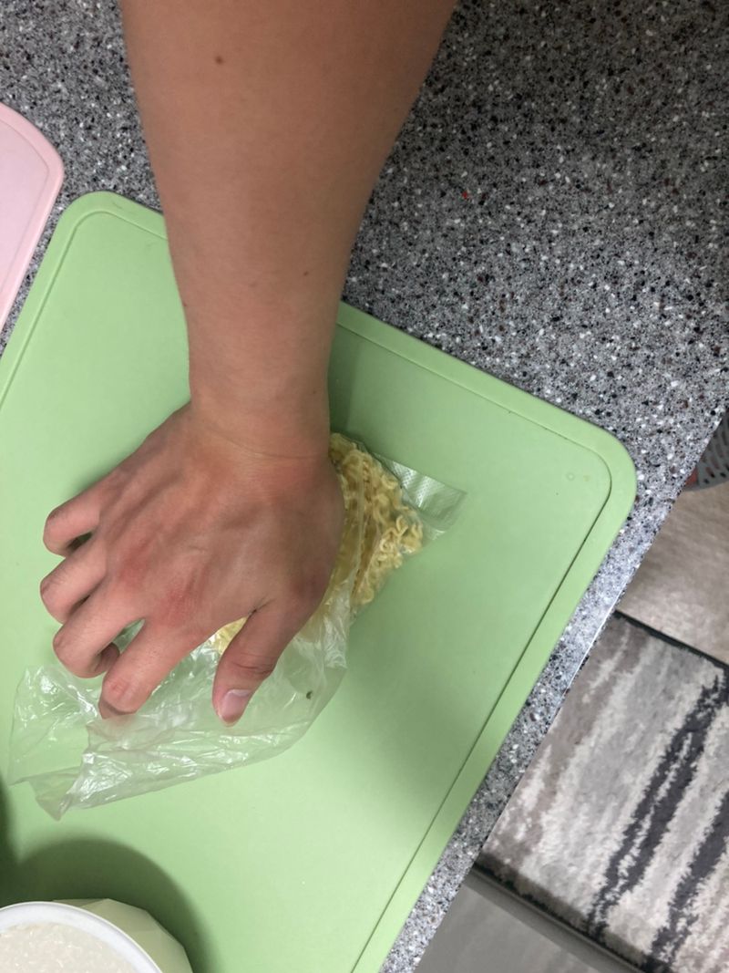 1. 라면 사리를 봉지에 넣고 으깨줍니다.