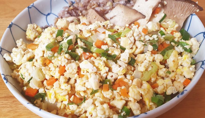 오늘 저녁, 냉장고에 있는 새송이버섯과 두부, 그리고 계란을 활용해서 간단하면서도 영양가 있는 덮밥을 만들어 보았습니다.