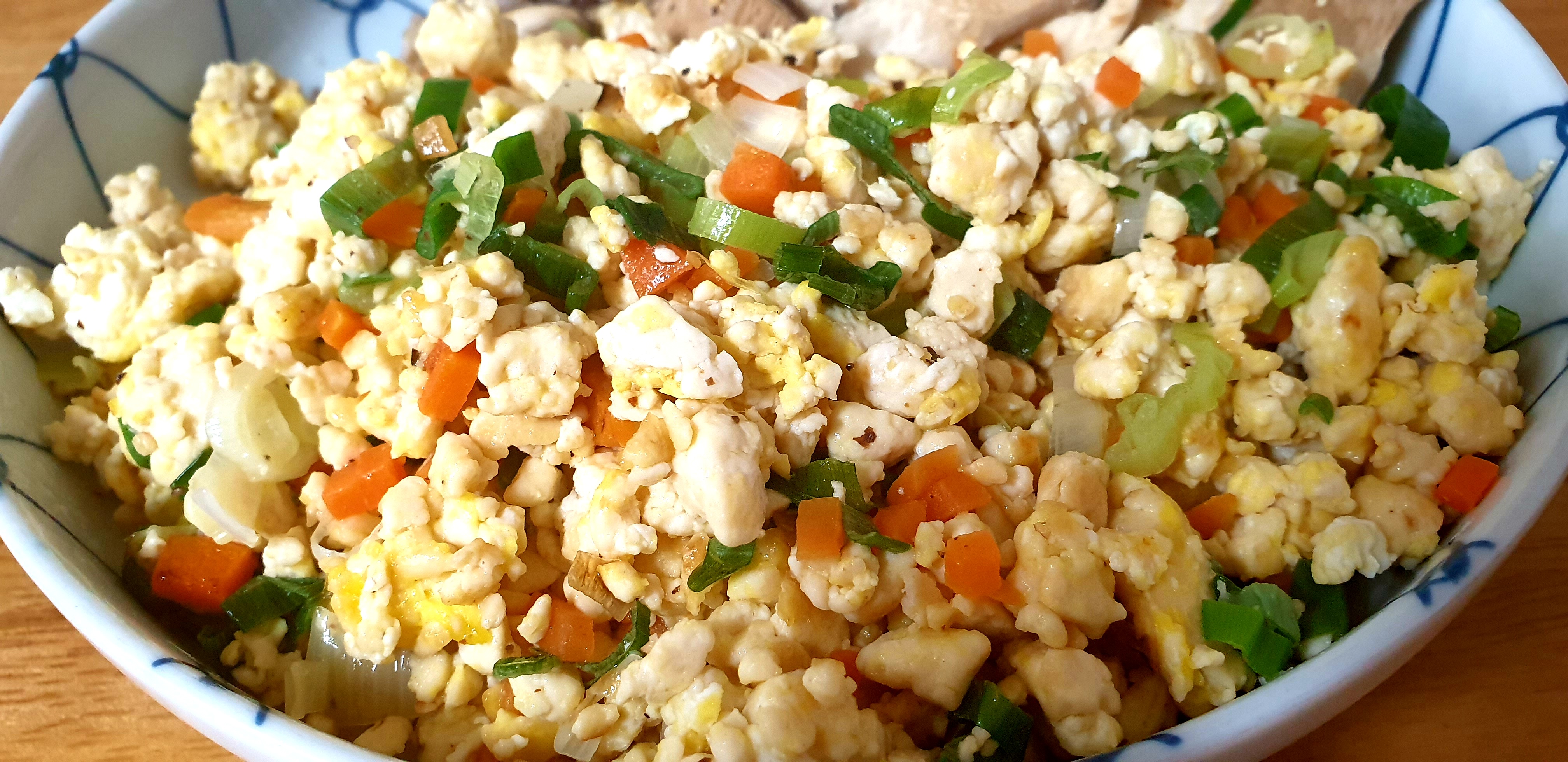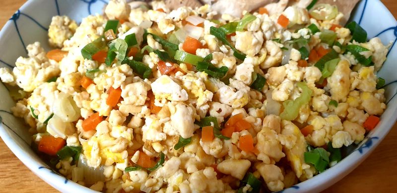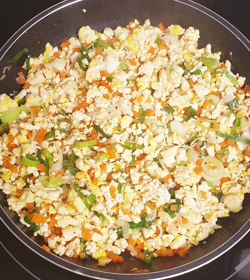 팬에 기름을 두르고 물기를 뺀 으깬 두부를 넣고 살짝 볶아주다가 계란 2개 넣고 다시 볶아 줍니다.