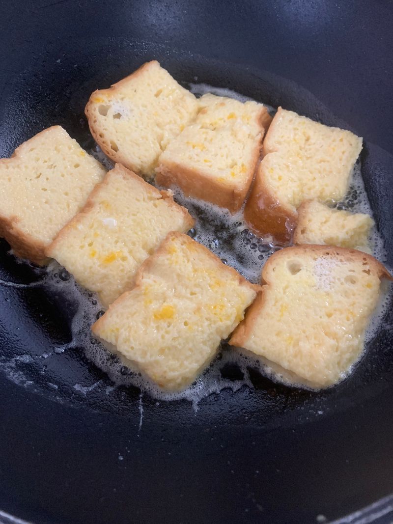 그러고 버터를 약불로 녹여주고 이정도면 싶을 때 계란물 입힌 식빵 넣어주었다!!