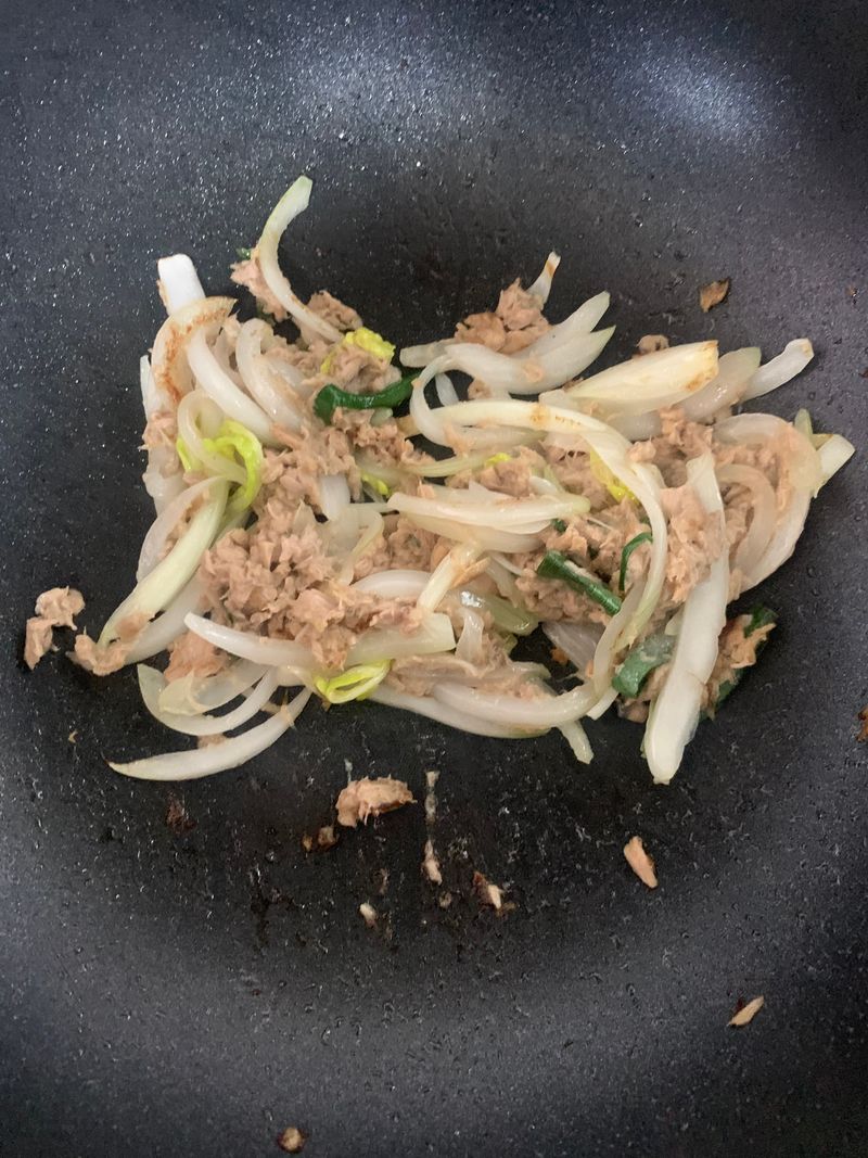 레시피에 있는 양파는 그대로 써주고 집에 없는 버섯 대신 양배추와 파를 썰어 넣어주고 새우와 베이컨, 고기 대신에 참치캔을 까서 넣어줬다!