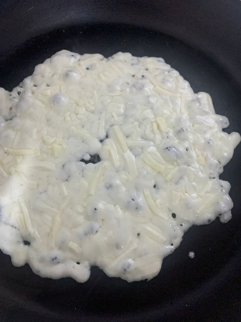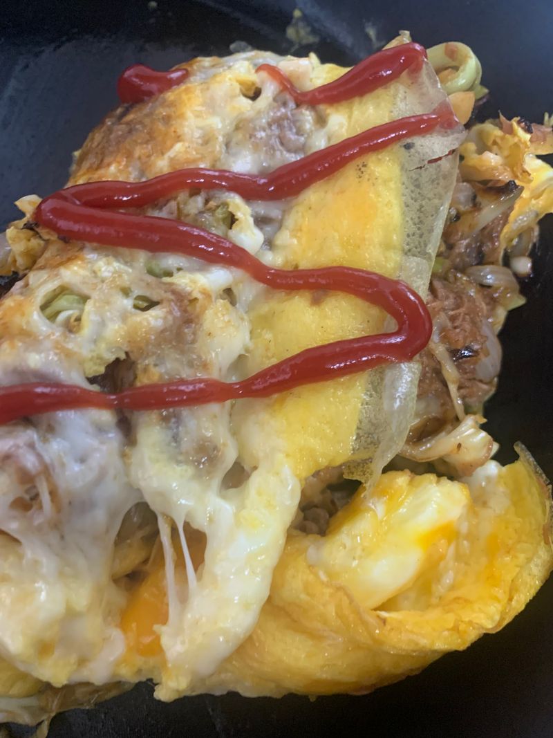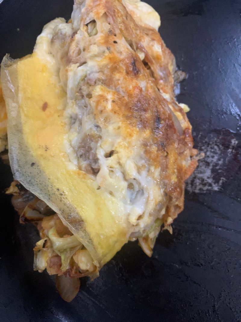 그 후에 치즈를 넣고 녹인 후 계란물까지 넣었다. 근데 또 문제점이 있다면 내가 뒤집기를 정말 못해서 아주 많이 걱정했는데, 다행히 반으로 잘 접을 줄 알았는데, 내용물이 너무 많아 터져버렸다...