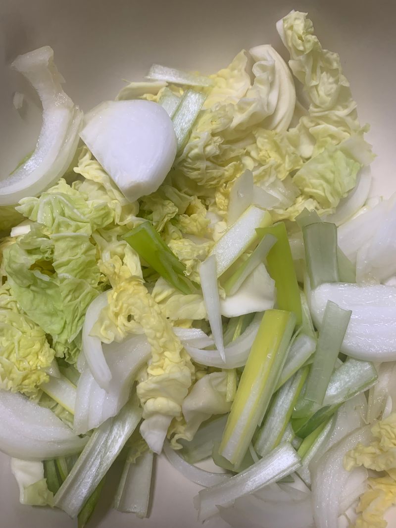 우선 야채를 썰어야하는데, 팁에서 정해진 재료 말고 냉장고에 있는 야채들 사용해도 된다 하길래! 양배추, 파, 양파를 사용하기 로 했다! (최대한 길게 썰려고 노력했다)
