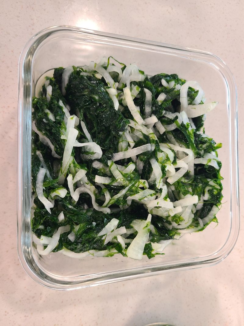 소금넣고 빡빡 문질러 씻어서 파래준비한 다음 무우는 채썰어 소금에 절여준다음 물기 꾹짜서 준비 파래와 무우를 섞어준다음 식초 설탕 조물해주면 새콤달콤 바다향가득 파래무침 완성 건강한 지구집밥 대령입니다