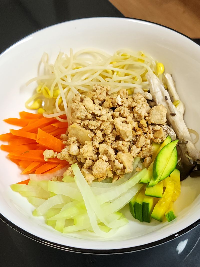 야채를 쪄서 만드는 건강한 비빔밥입니다.