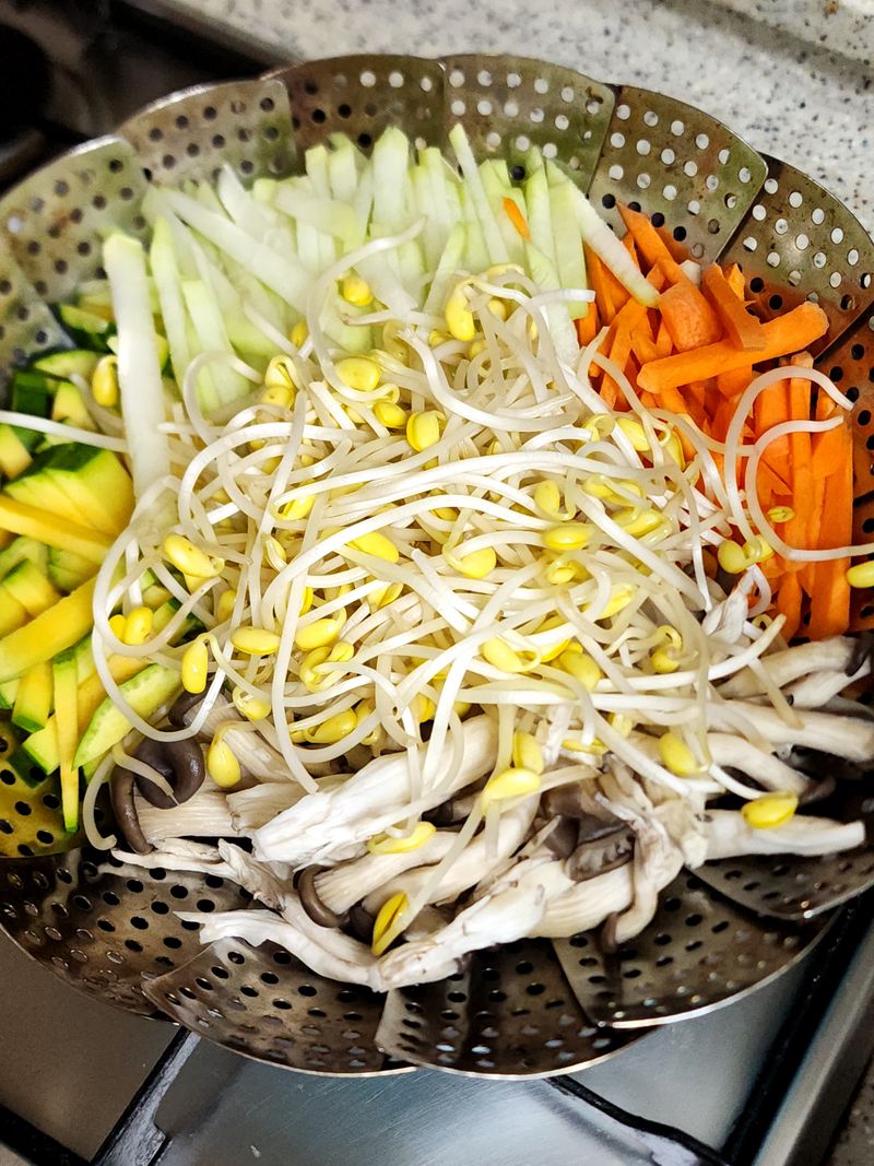 찜기에 손질한 야채를 올리고 쪄줍니다.