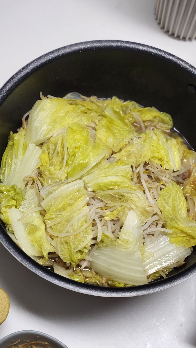 별거 없어요~ 물에 연두와 비건 된장, 고춧가루, 배추, 파를 넣고 끓이면 된답니다^^ 깔끔시원 비건 배춧국!
