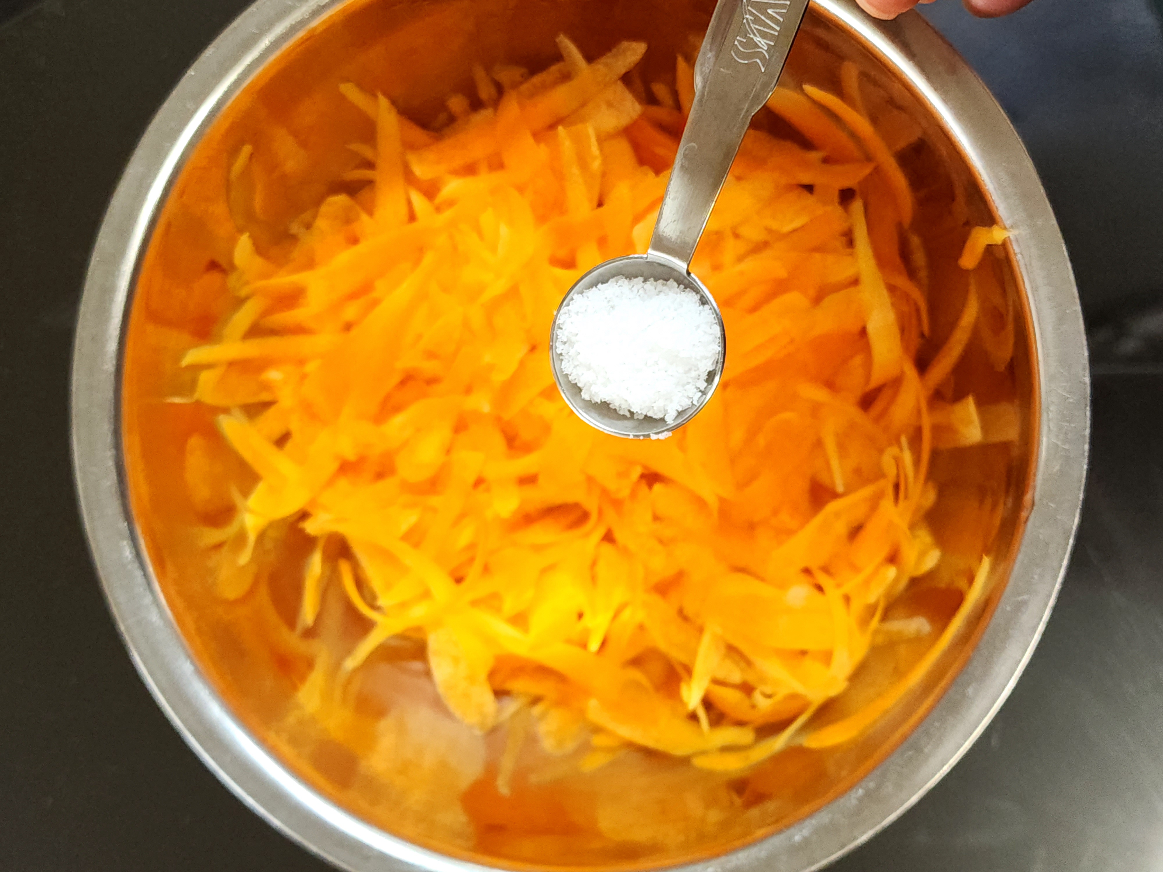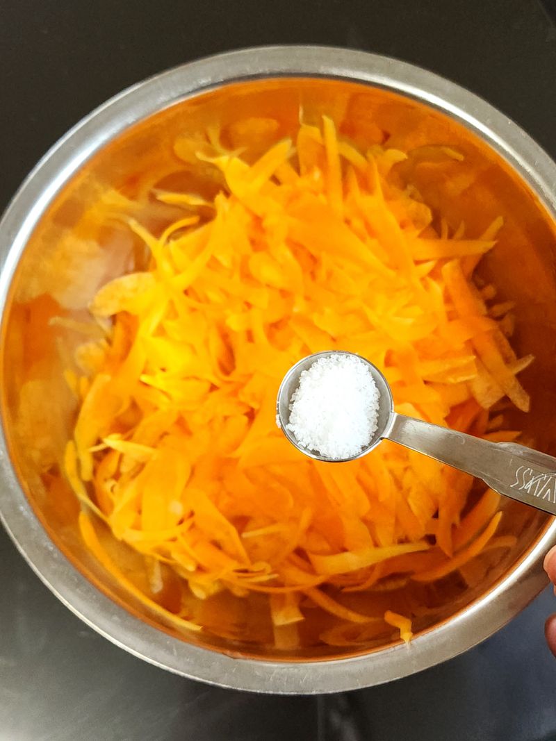 당근은 채깔로 얇게 썰어준다음 소금 1티스푼 넣어 절여주고