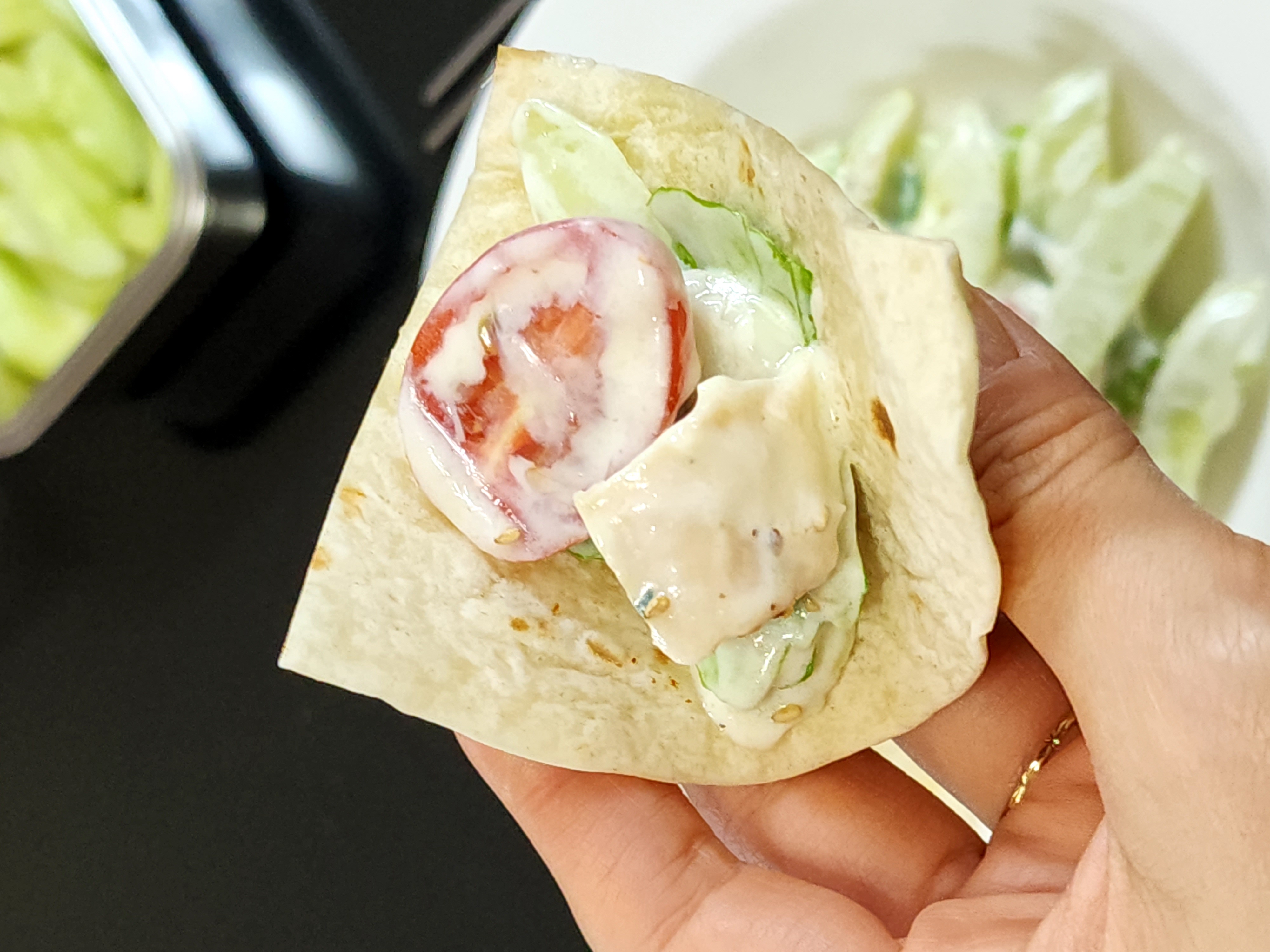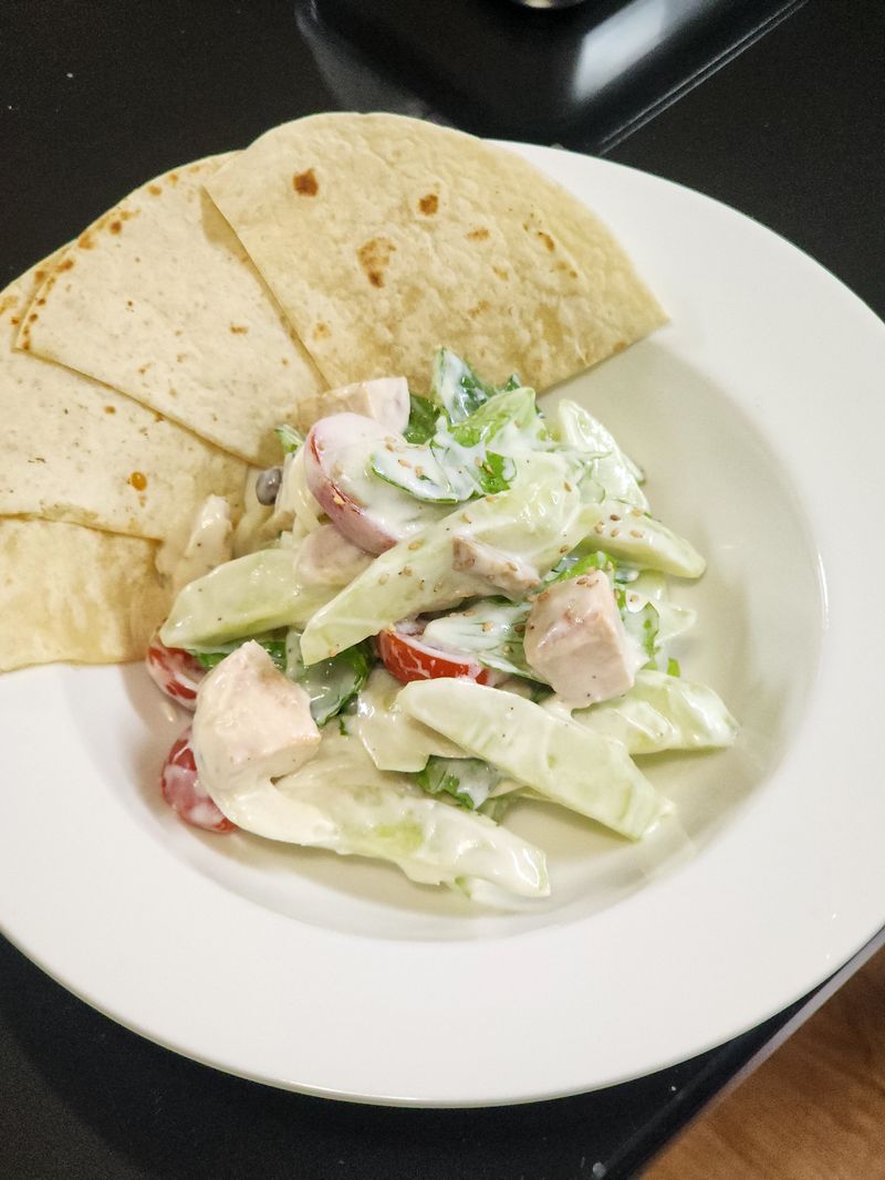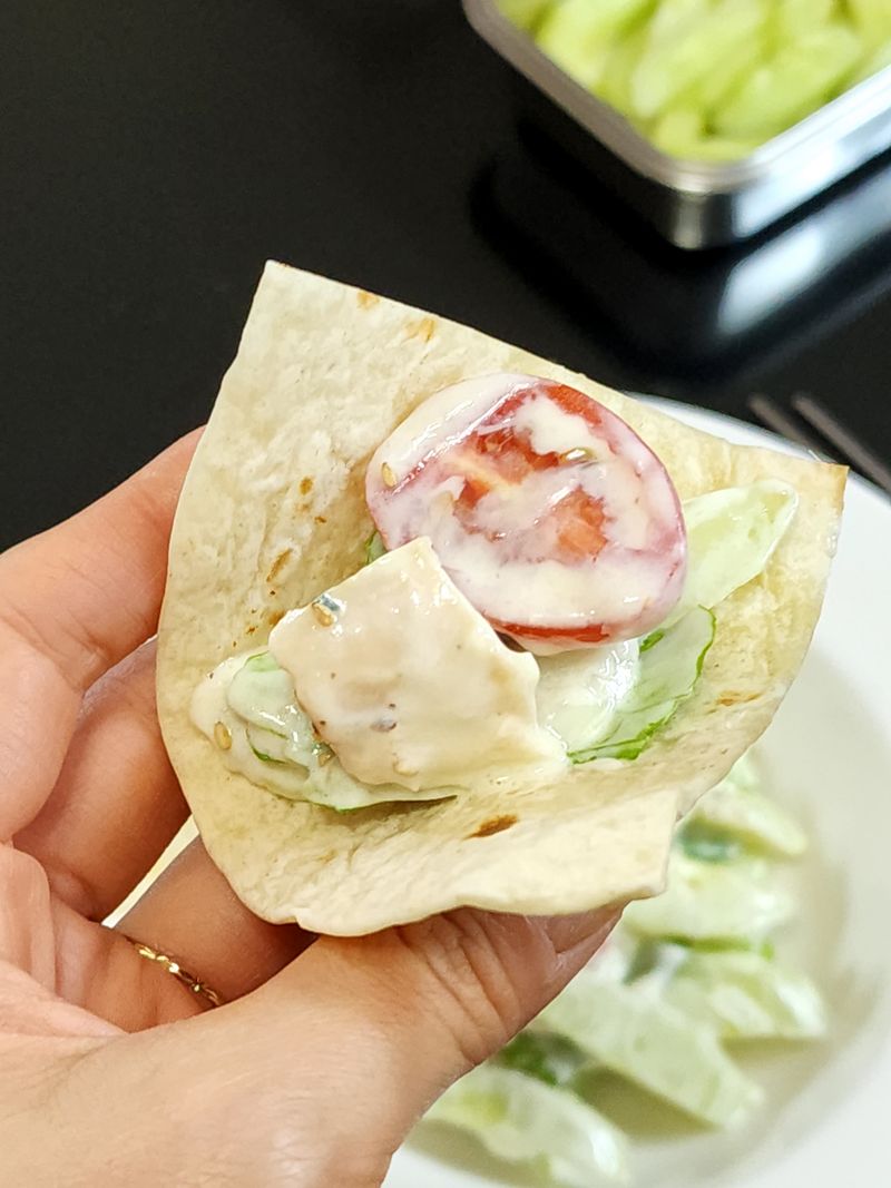 오이,양파,닭가슴살, 토마토 먹기좋게 썰어주고 그릭요거트 작은거 한통, 올리브오일2, 레몬즙1, 알룰로스1, 소금/후추 조금 넣고 버무려주면 끝 또띠아에 싸먹으면 너무 맛있어요.