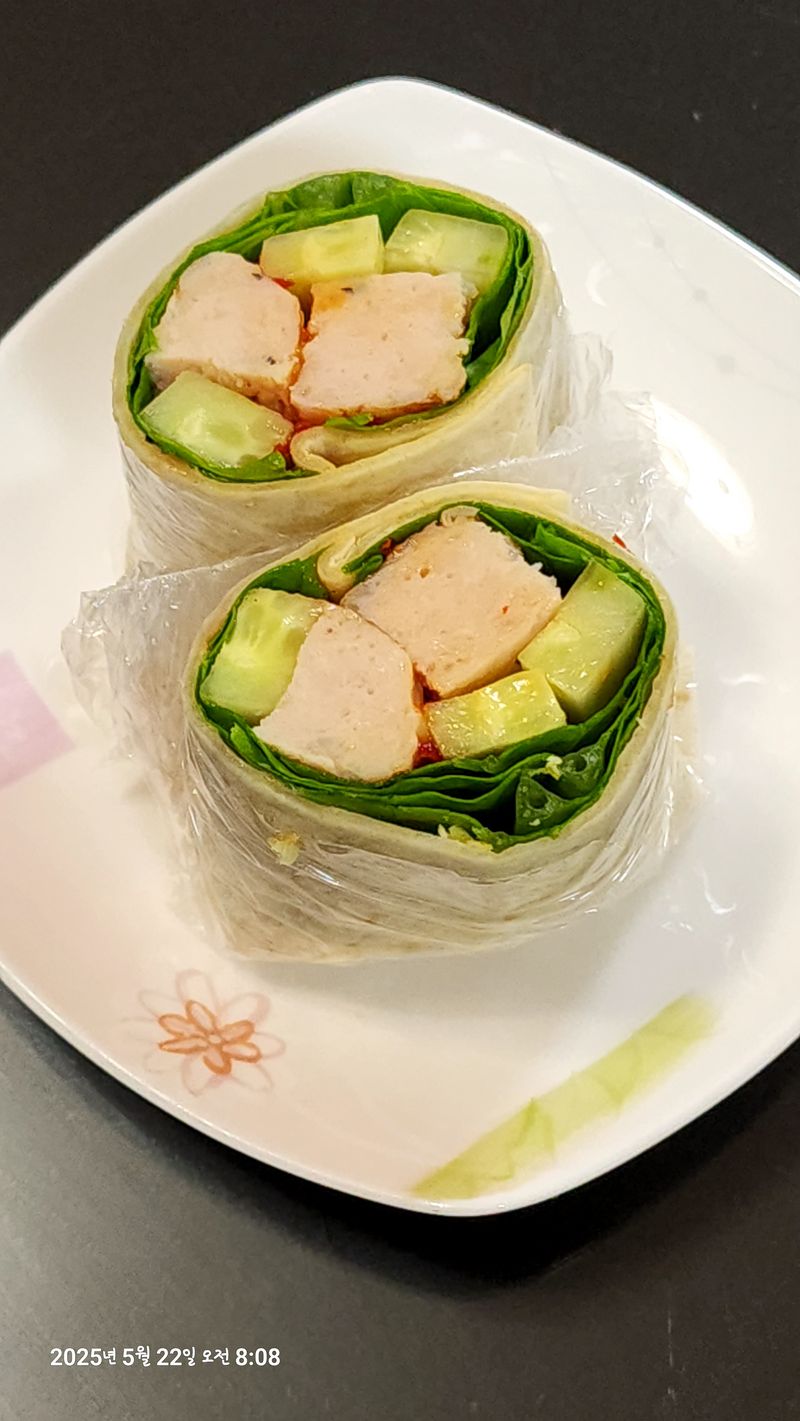 또띠아에 상추올리고 오이올리고 닭가슴살올려서 스리라차 소스 조금 뿌리고 돌돌말아주면 닭가슴살 또띠아랩 바쁜 아침 식사대용으로 간식으로도 너무 좋은 또띠아랩입니다.