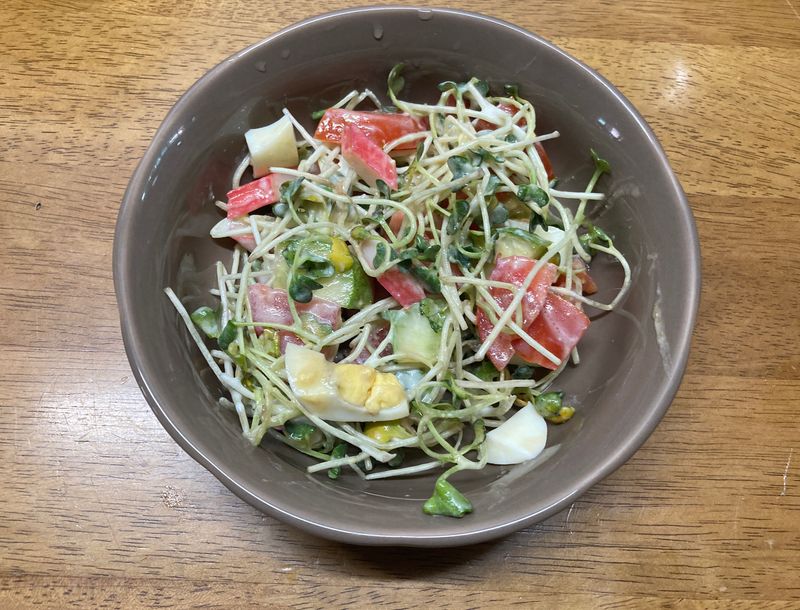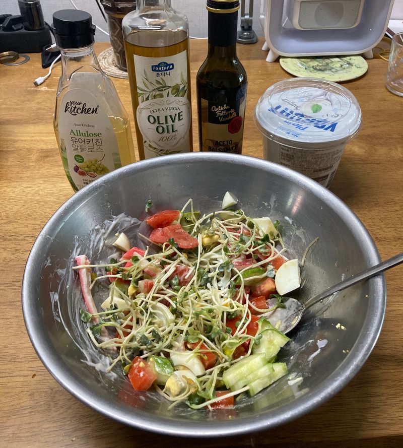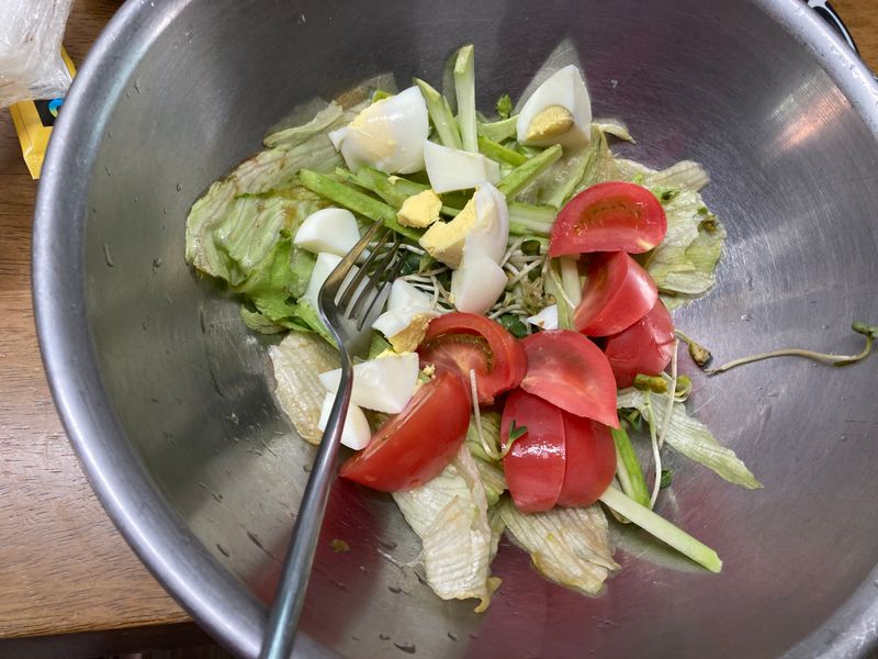 잎채소를 얻게되어서 야채샐러드를 기본으로 계란이나 치킨 너겟, 맛살 등의 단백질을 추가해 주었어요.