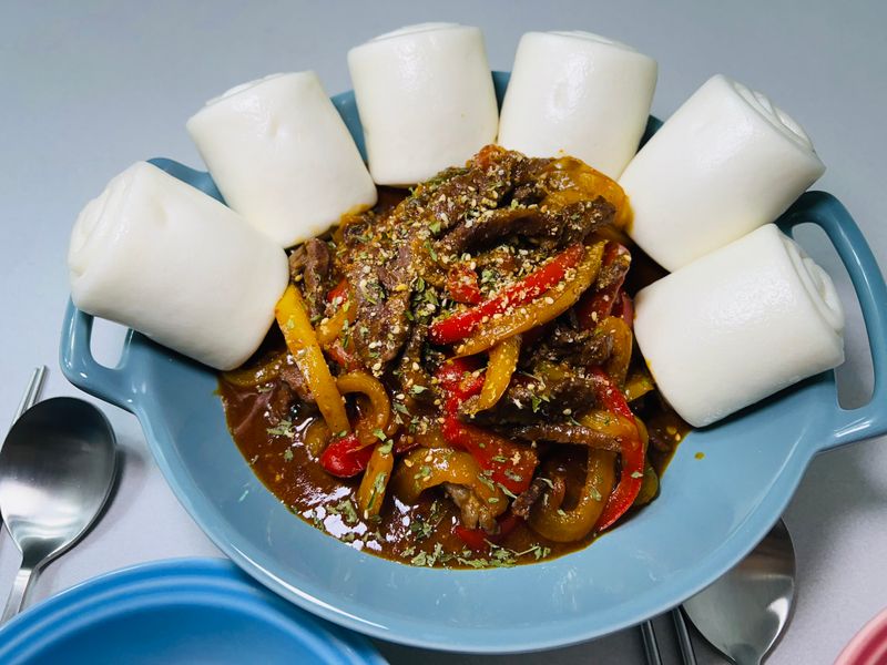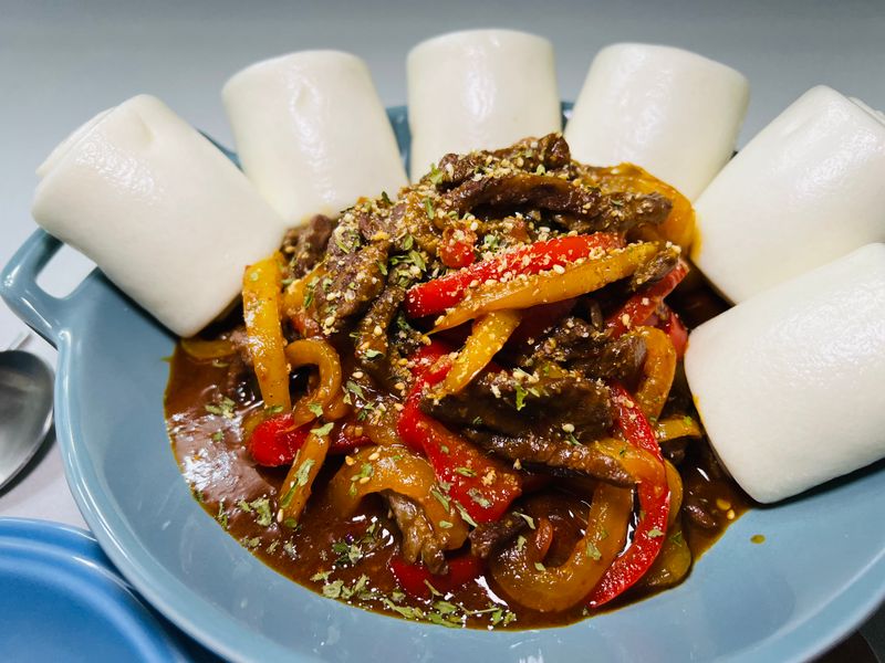 팬에 다진마늘과 오일, 고춧가루를 넣어서 고추기름을 내주고 고기를 먼저 넣어 볶아준후 파프리카와 양파도 넣어 숨이 죽을때까지 볶아줍니다. 그후 소스만 넣으면 끝!!