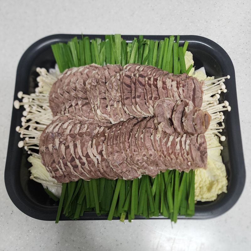 숙주, 배추, 팽이버섯, 부추와 함께 전골로 끓여먹었어요.