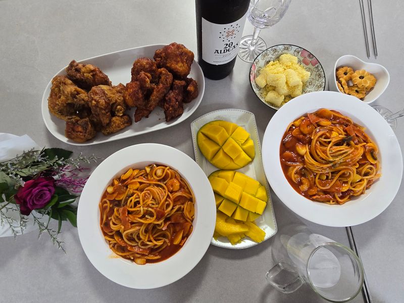 나가서 먹기도 애매하고 집에서 후다닥 파스타랑 간단하게 만들었네요~ 그래도 기념일이니 와인과 함께♡