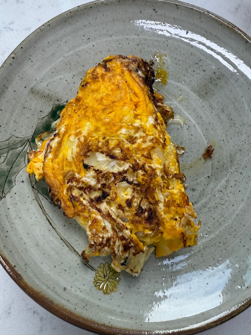 양배추를 먼저 연두로 볶고 계란을 그 위에 깨서 치즈를 마지막에 얹어줍니다.