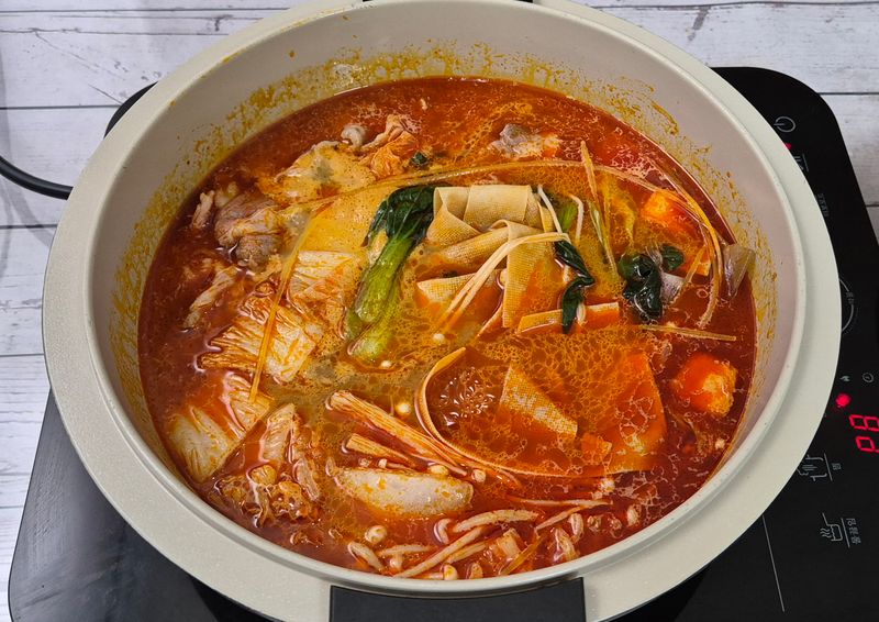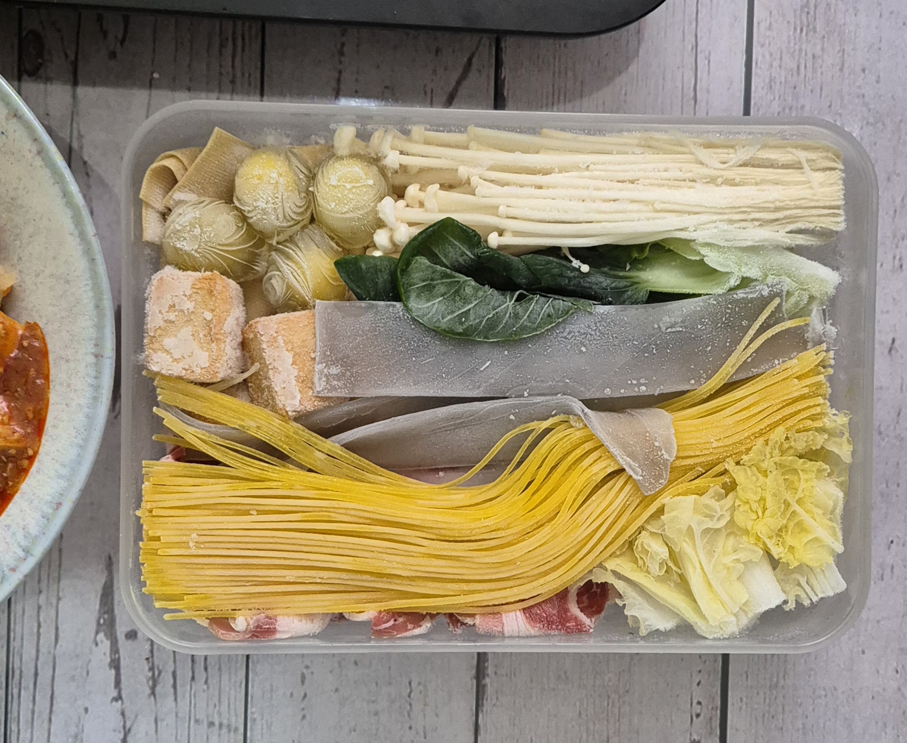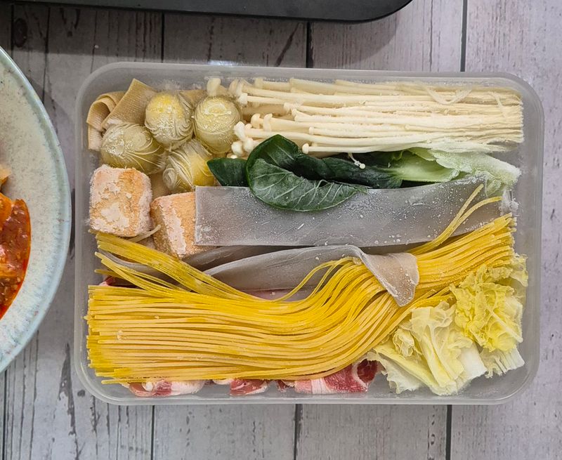 우삼겹, 배추, 청경채, 팽이버섯, 포두부, 중국당면, 옥수수면, 피쉬볼, 메추리알 넣어서 다이소 말랑핏 1.6L에 밀키트했는데, 메추리알은 질겨지니 넣지 마시길 추천 드립니다..ㅋㅋㅋ