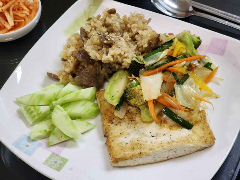 두부를 매번 조그맣게 잘라 구웠는데 이번에는 한모를 반으로 나누어 큼직하게 잘라 구워봤어요. 각종 야채를 연두로만 간해 볶아서 함께 냈더니 근사한 두부스테이크 완성. 야채와 두부만으로도 근사한 한끼가 완성됩니다.