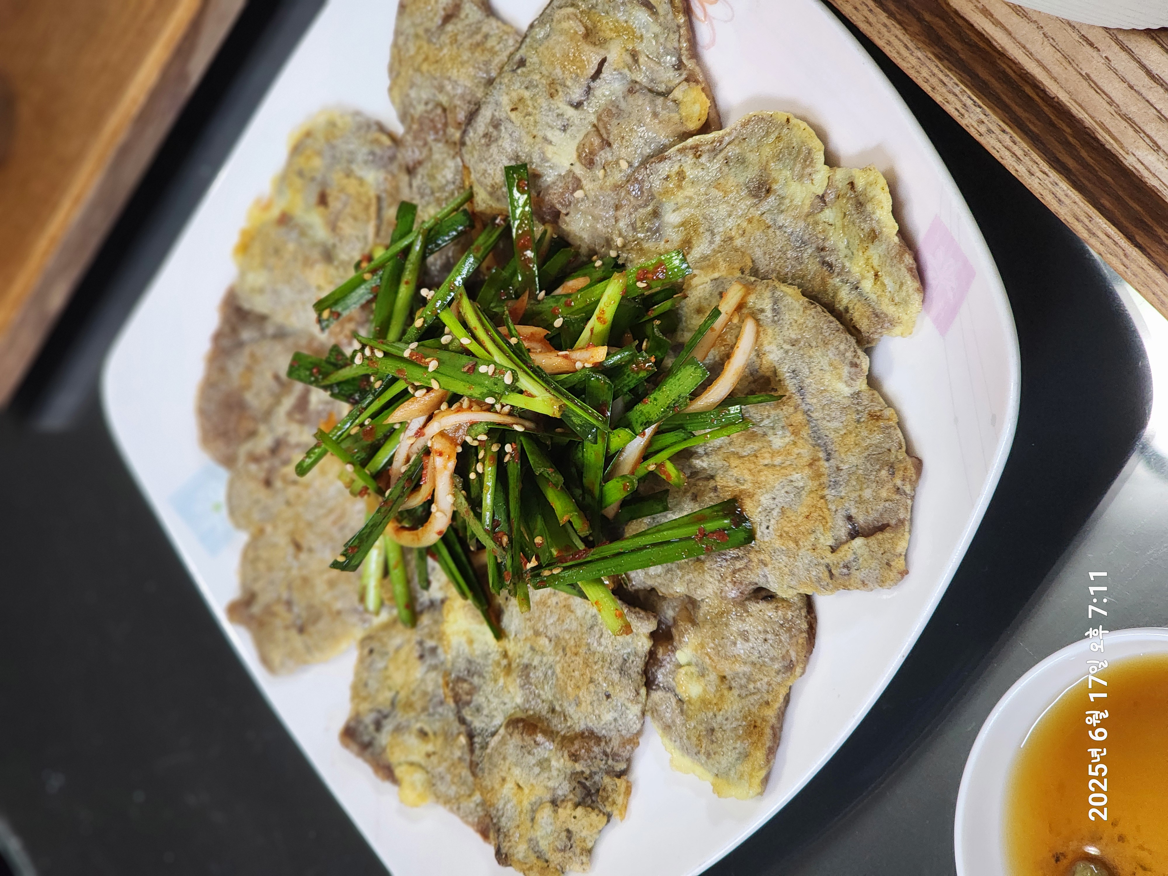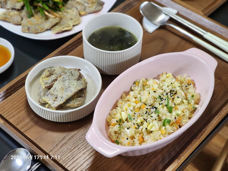 고소하게 육전부쳐내고 계란으로 계란볶음밥 만들어서 한상차려냈어요. 여름에는 반찬 이것저것 하기보다 한그릇음식이랑 메인음식으로 주고 식탁을 채우는것 같네요.