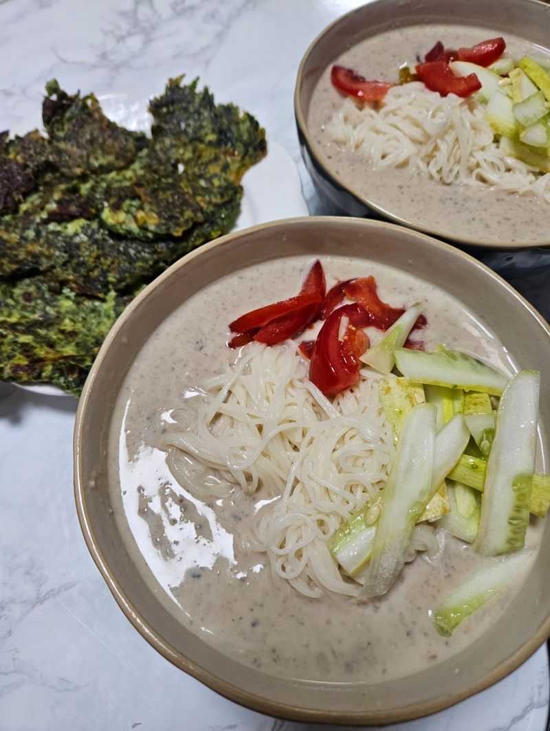 두유와 두부로 만든 콩국수입니다! 고명으로 싱싱한 토마토와 오이를 썰어서 맛과 식감까지 챙겼어요! 콩국수 안좋아하는 가족들도 이렇게 해주면 잘 먹어요 어쩌다 보니 비건음식이 됐네요ㅎㅎ 콩가루나 깻가루 넣어주면 더 고소하고 맛이 좋습니다! 더운 여름 맛있는 음식들로 지치지 말고 다들 힘내시길 바랍니다~!