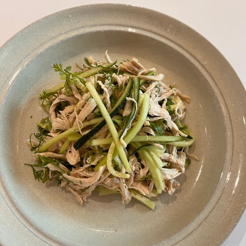 제철인 오이를 활용한, 초계 샐러드에요. 닭가슴살은 뜨거운 물에 삶아 결대로 찢고 오이도 함께 채 썰어 소금, 후추, 레몬즙으로 간을 했어요. 간단하지만 단백질과 입맛 돋구어 주는 상큼함도 함께