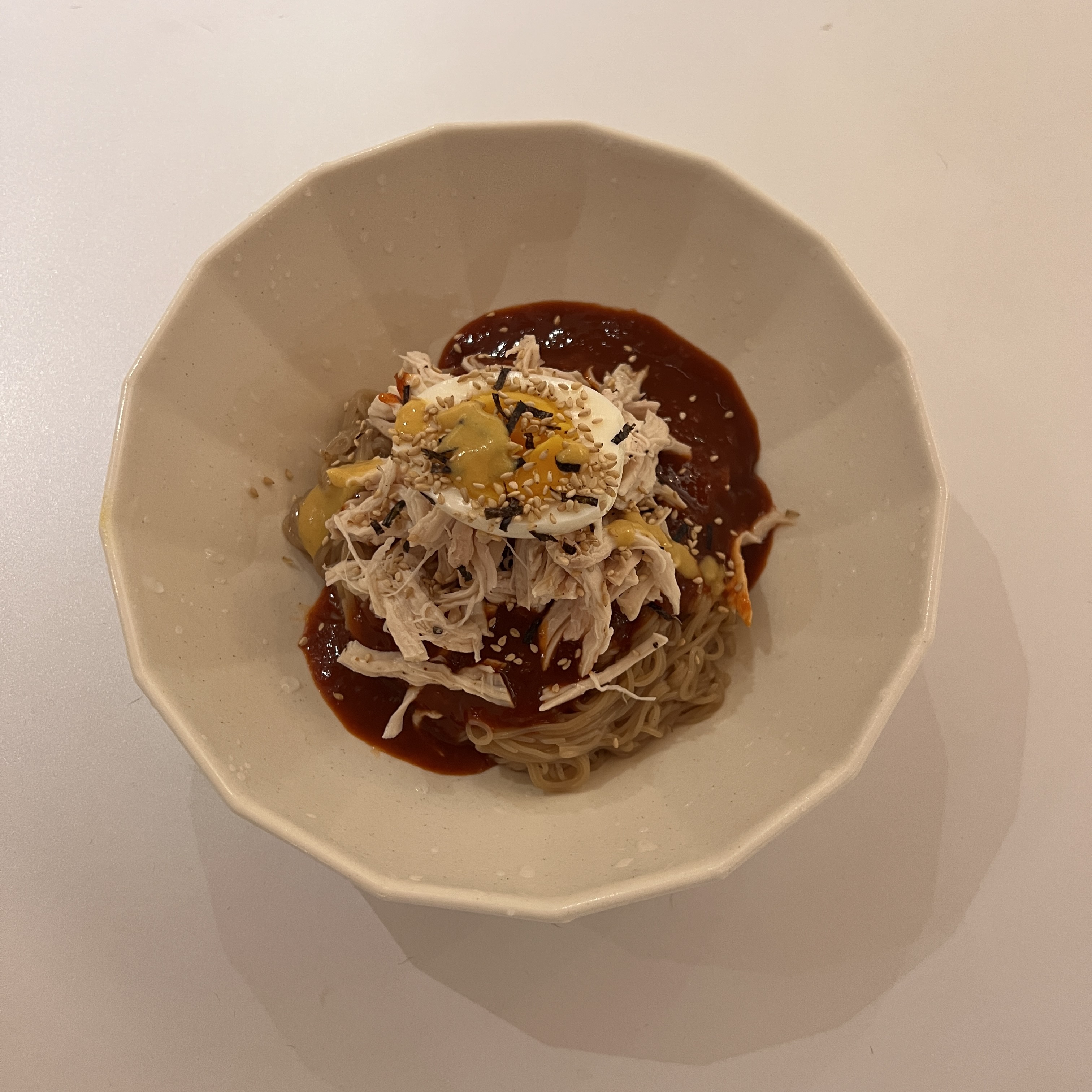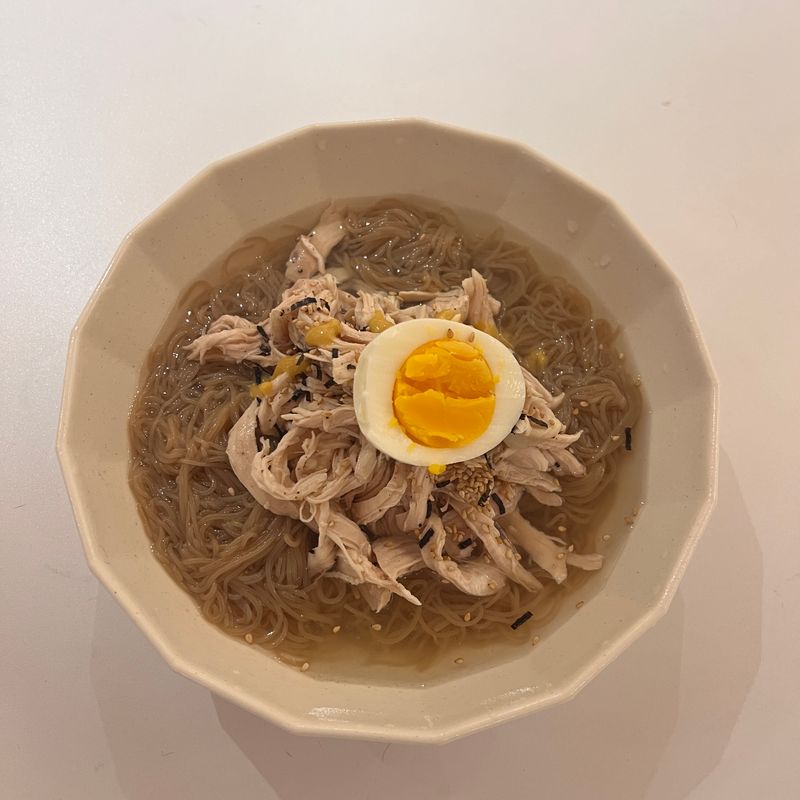 시판용 냉면은 너무 다양하게 잘 나와 있어서 활용해서 초계 냉면 만들었어요. 냉면 삶아서 얼음물에 깨끗이 씻어주고 닭가슴살 소금, 후추, 맛술 넣어 찢어서 얹어 주면 끝이에요. 물냉면도 비빔냉면도 닭가슴살 올라가면 훨씬 맛있어요