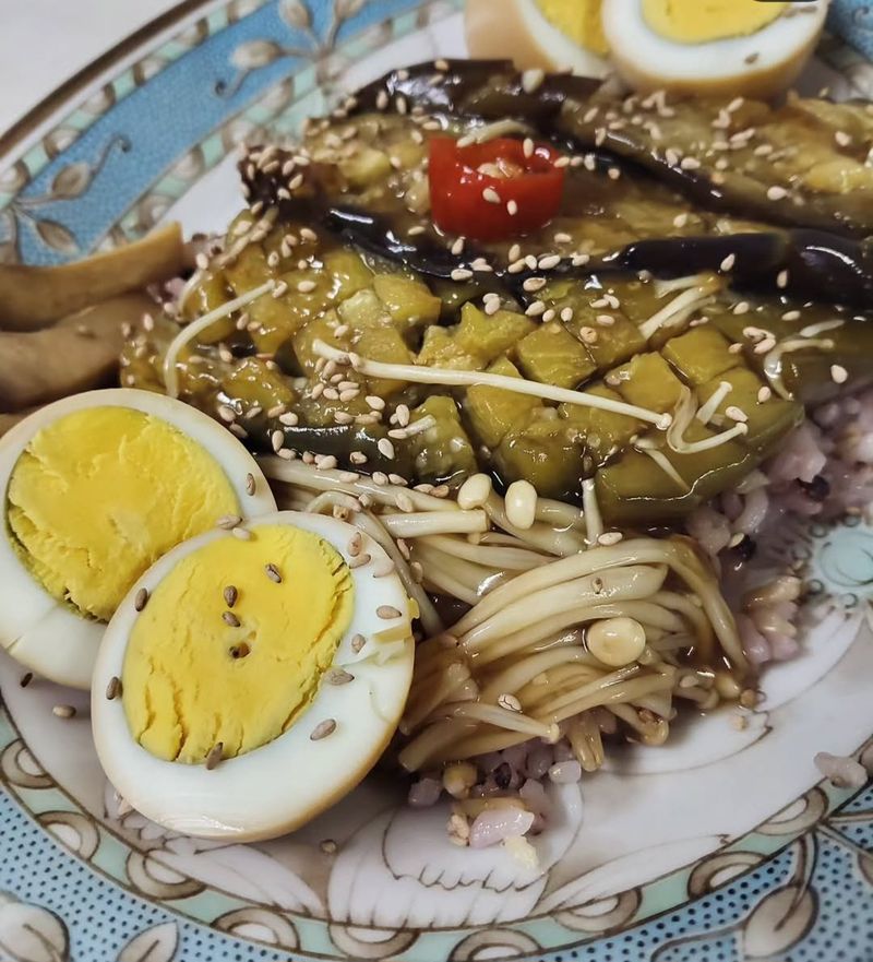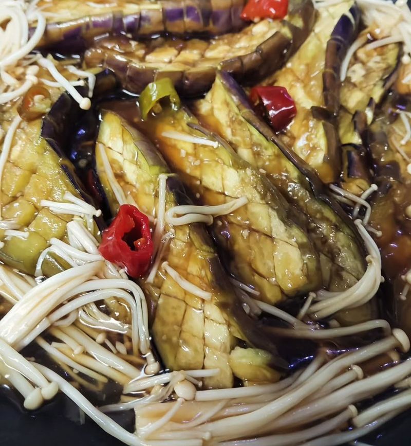 팽이와 삶은달걀을 더하고 전분물 살짝 볶아내면 중화요리풍 굴소스 칼집가지 요리 완성 맛있어요