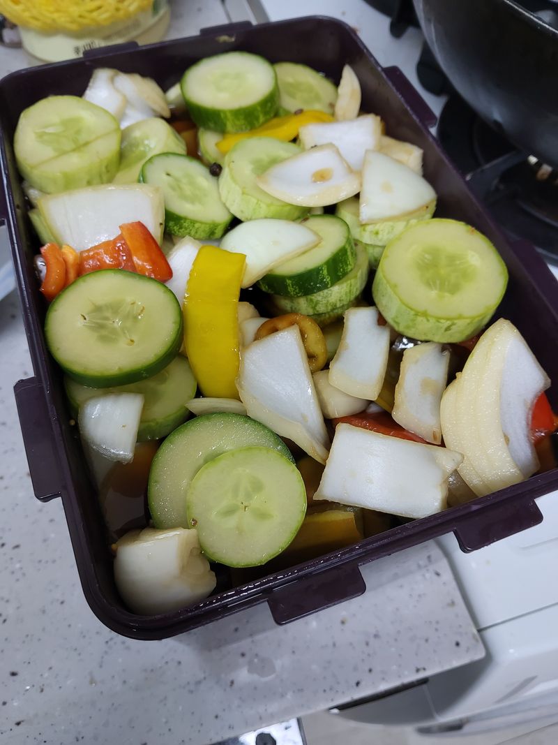 닭두마리로 김치찜 한솥. 삼계탕 한솥 아침에는 삼계탕으로 점심 저녁에는 닭김치찜으로 집밥해결 여름 든든하게 말복을 보내다. 요즘 싼오이와 양파로 오이양파피클을 만들어 함께 먹으면 개운한 밥반찬으로 최고다