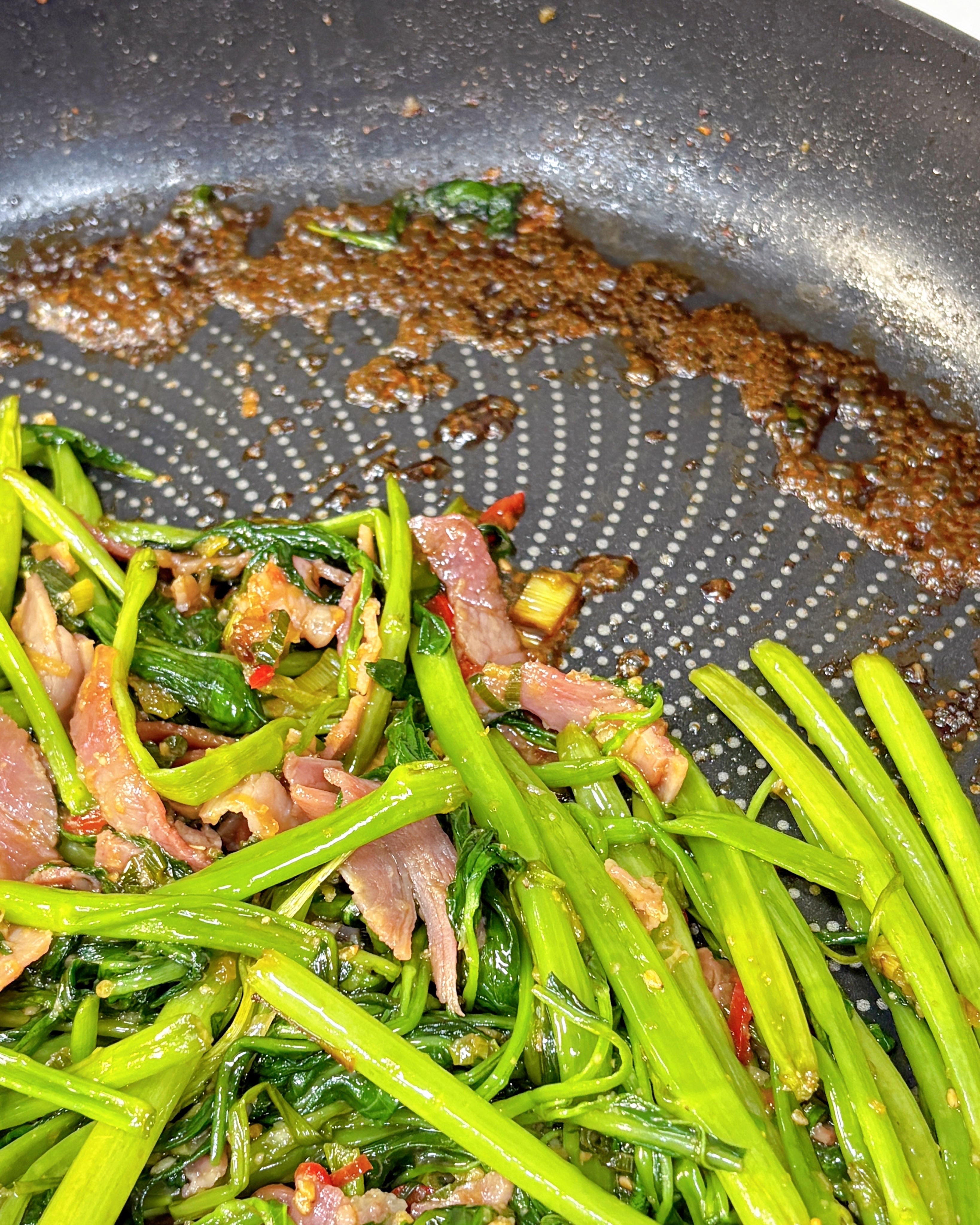 6. 한쪽에 줄기부분+소스 넣고 중약불로 볶기