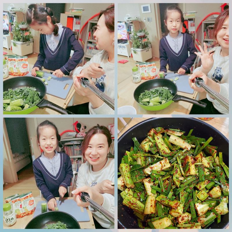 엄마의 첫 오이 김치이자 ,우리 딸의 첫 오이김치 . 어려울줄 알았는데 작년 미술대회 상품으로 받은 새미시리즈 덕에 매우 성공적 느낌 입니다 . 가족과 함께 요리는 즐거워!
