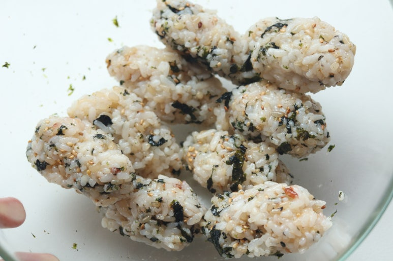김가루 2T를 넣고 섞어 길쭉한 주먹밥 모양으로 만들어 줍니다.