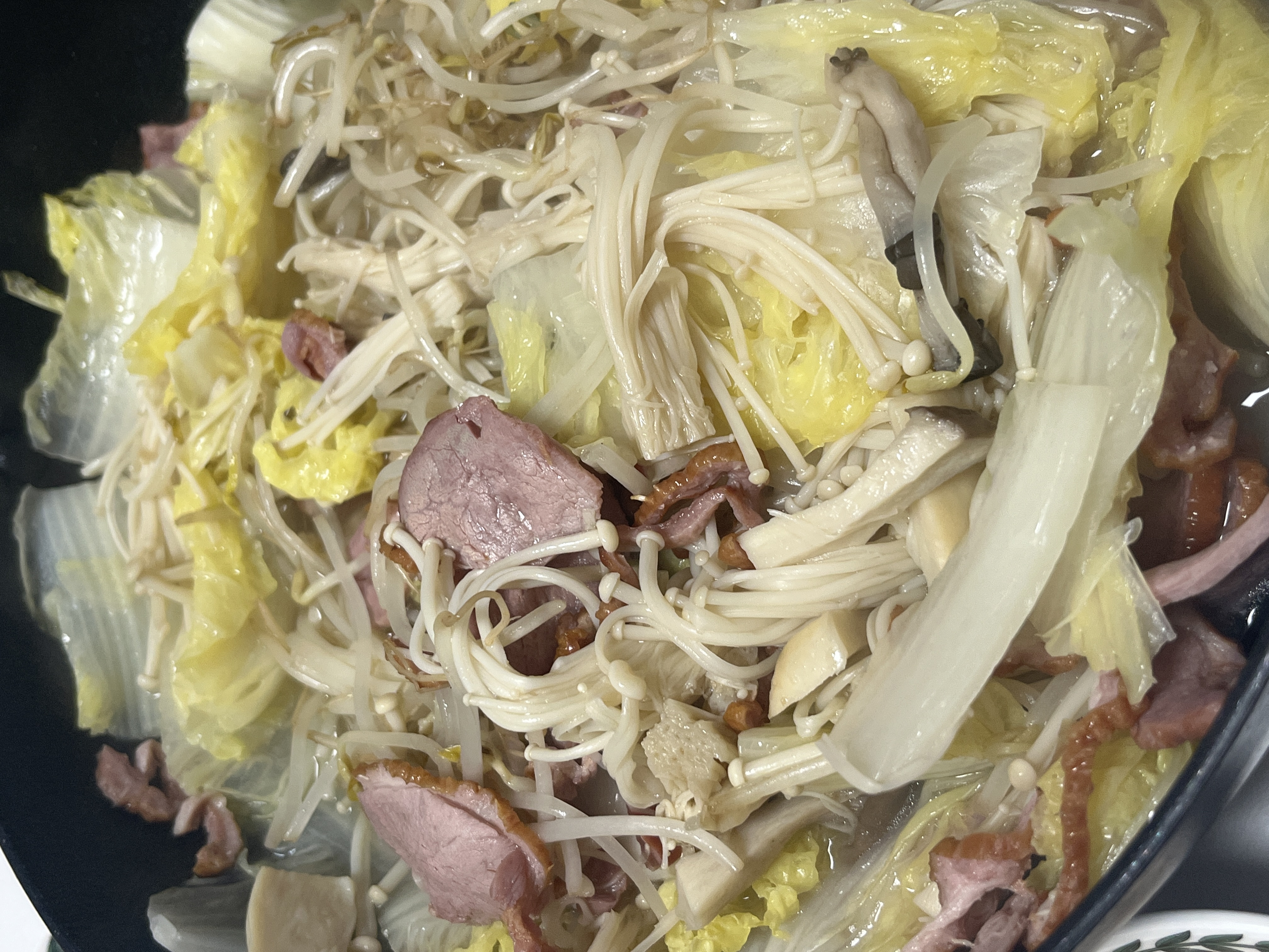 재료로는 팽이버섯+느타리버섯+새송이버섯+배추+숙주+훈제오리 이렇게 들어갔어요!