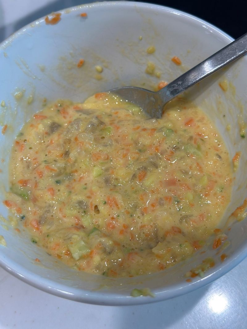 거기에 계란 1알, 쌀가루 1~2스푼 넣고 살짝 되직하게 만들어 기름에 부쳤답니다.