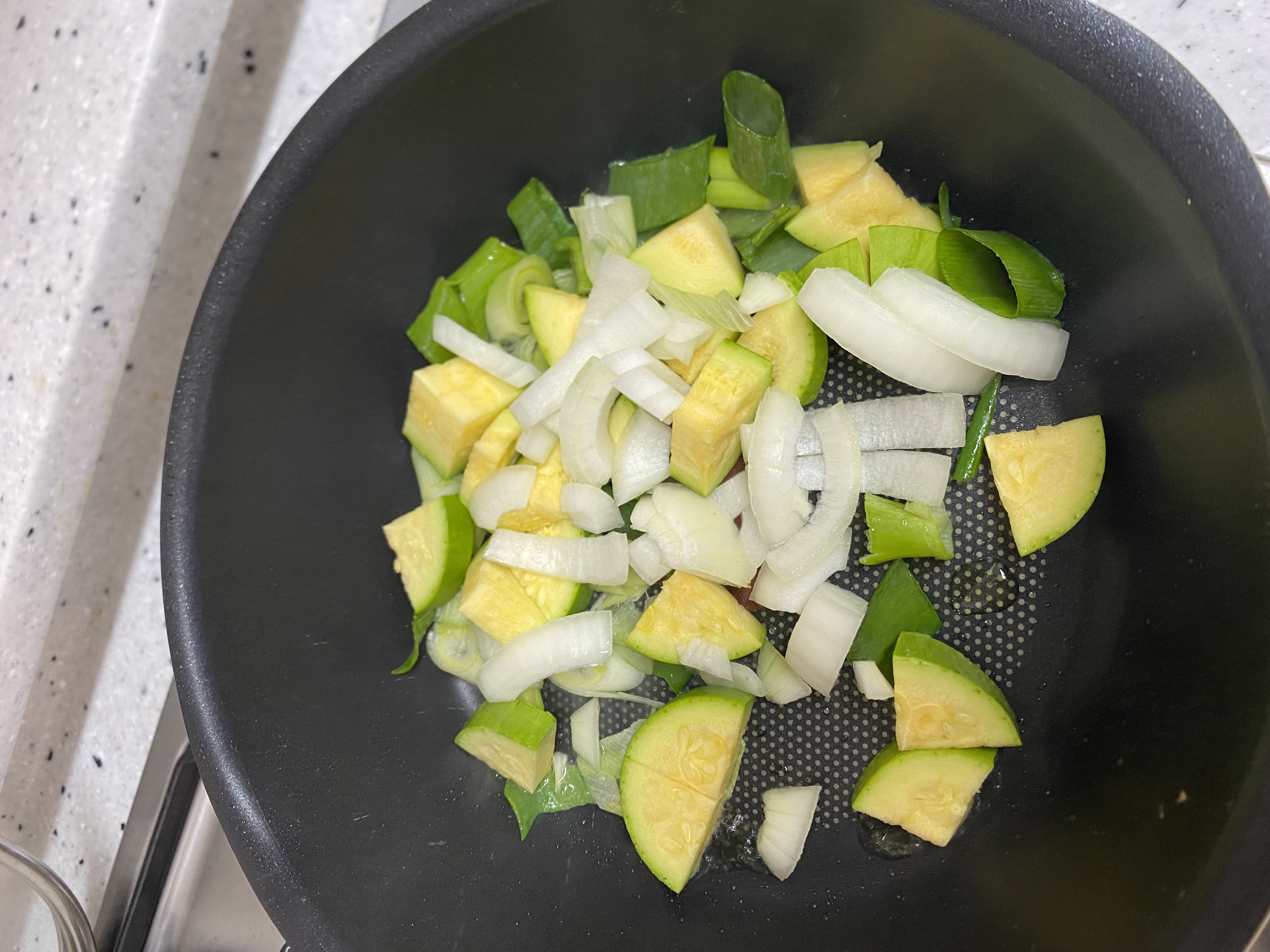 사진을 찍으려고 예쁘게 정리해 둔 재료들을 한곳에 두고, 후라이팬에 기름을 두른 뒤 재료를 넣기 시작했다. 두부도 조금 넣었는데, 두부와 애호박을 함께 넣으면 두부가 탈 것 같아서 애호박, 양파, 파를 먼저 넣었다.