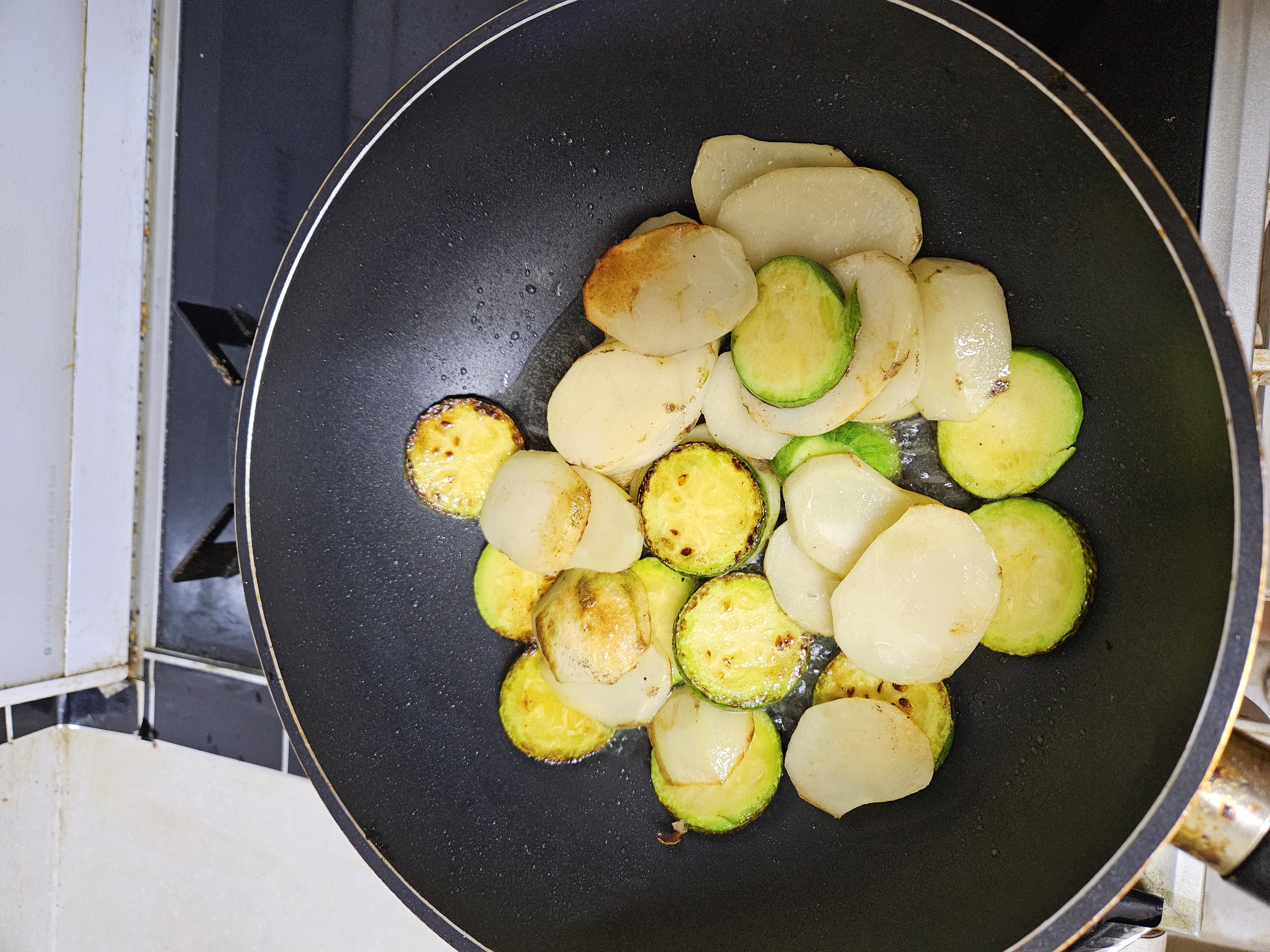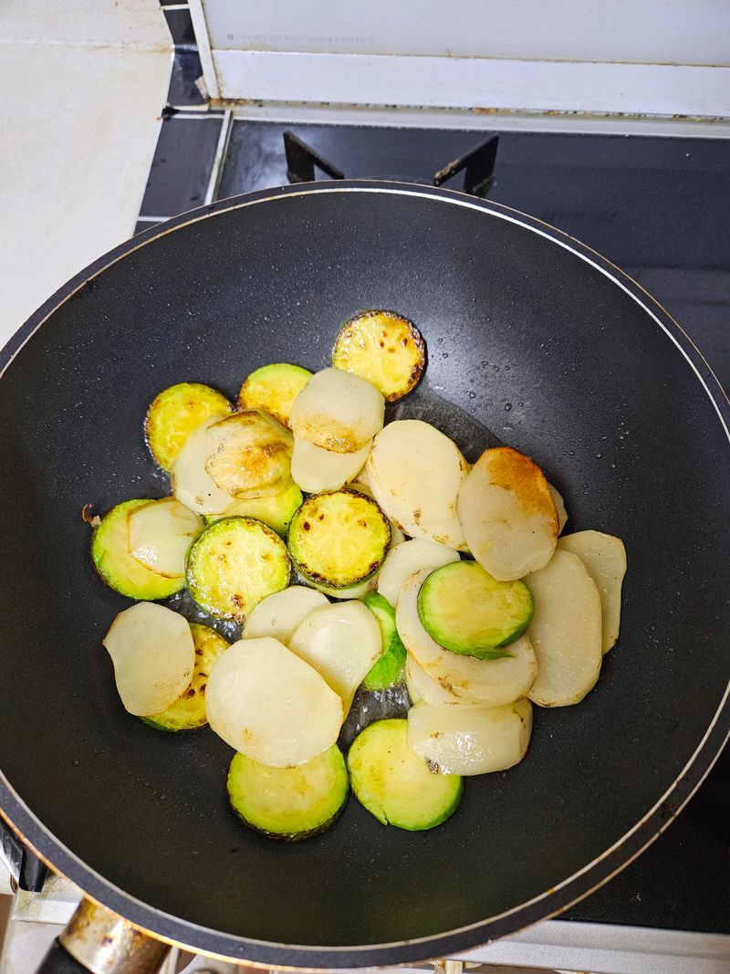 3. 식용유를 두르고, 후라이팬에 감자를 먼저 올리고 볶다가 애호박을 넣고 함께 익혀준다.