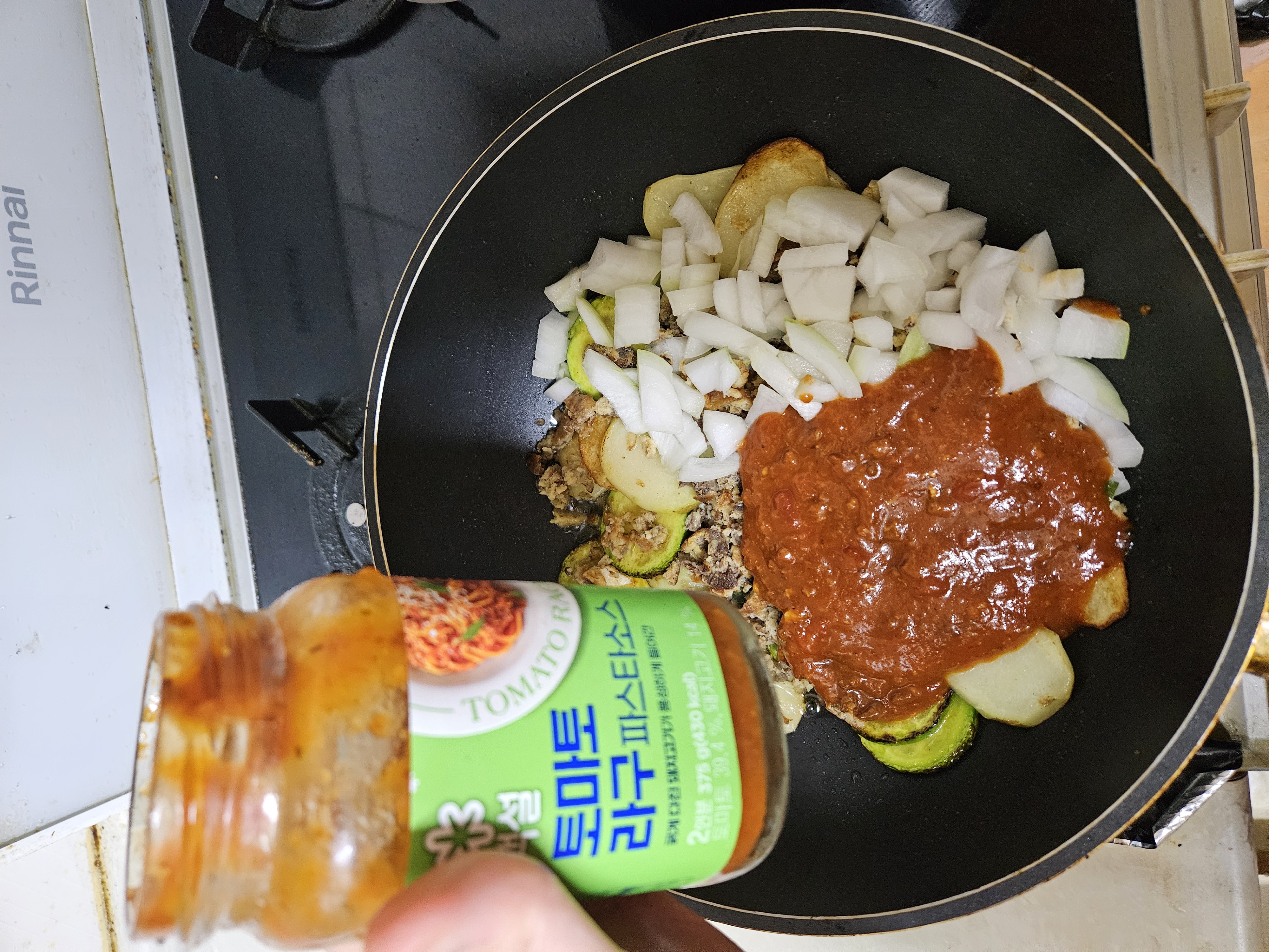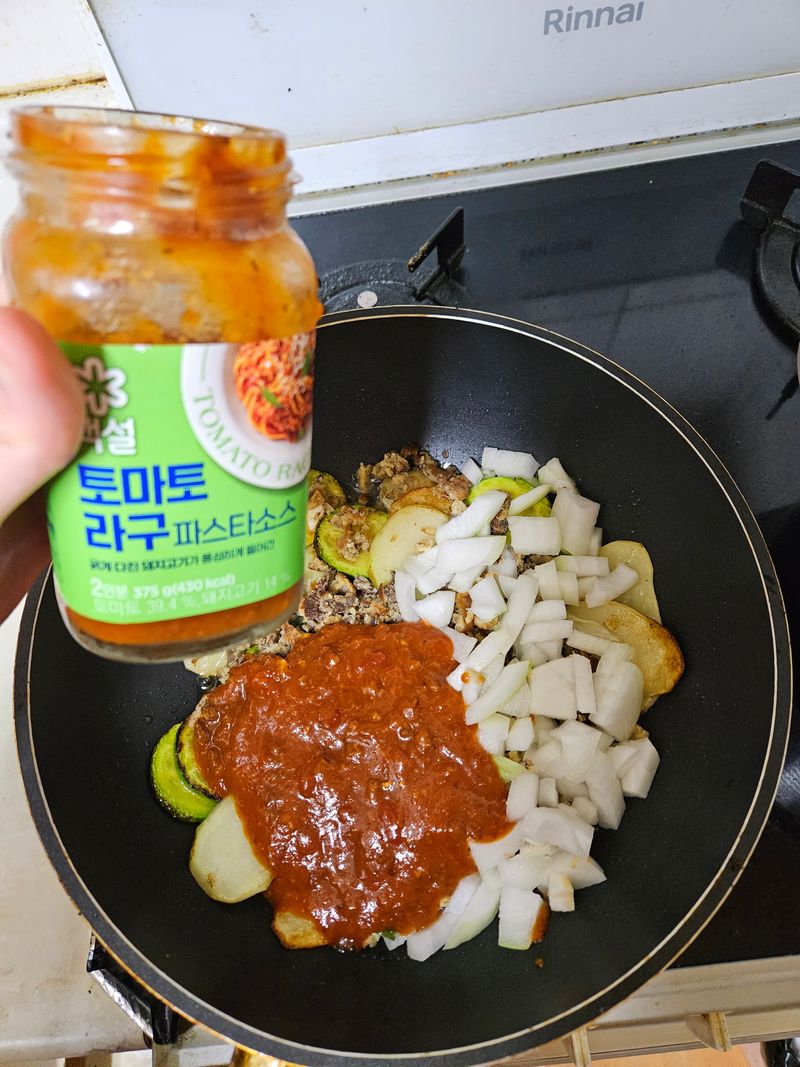 5. 라구소스 1/3통, 다진마늘 2T, 소금, 후추를 넣고 강한불에서 빠르게 볶아준다.