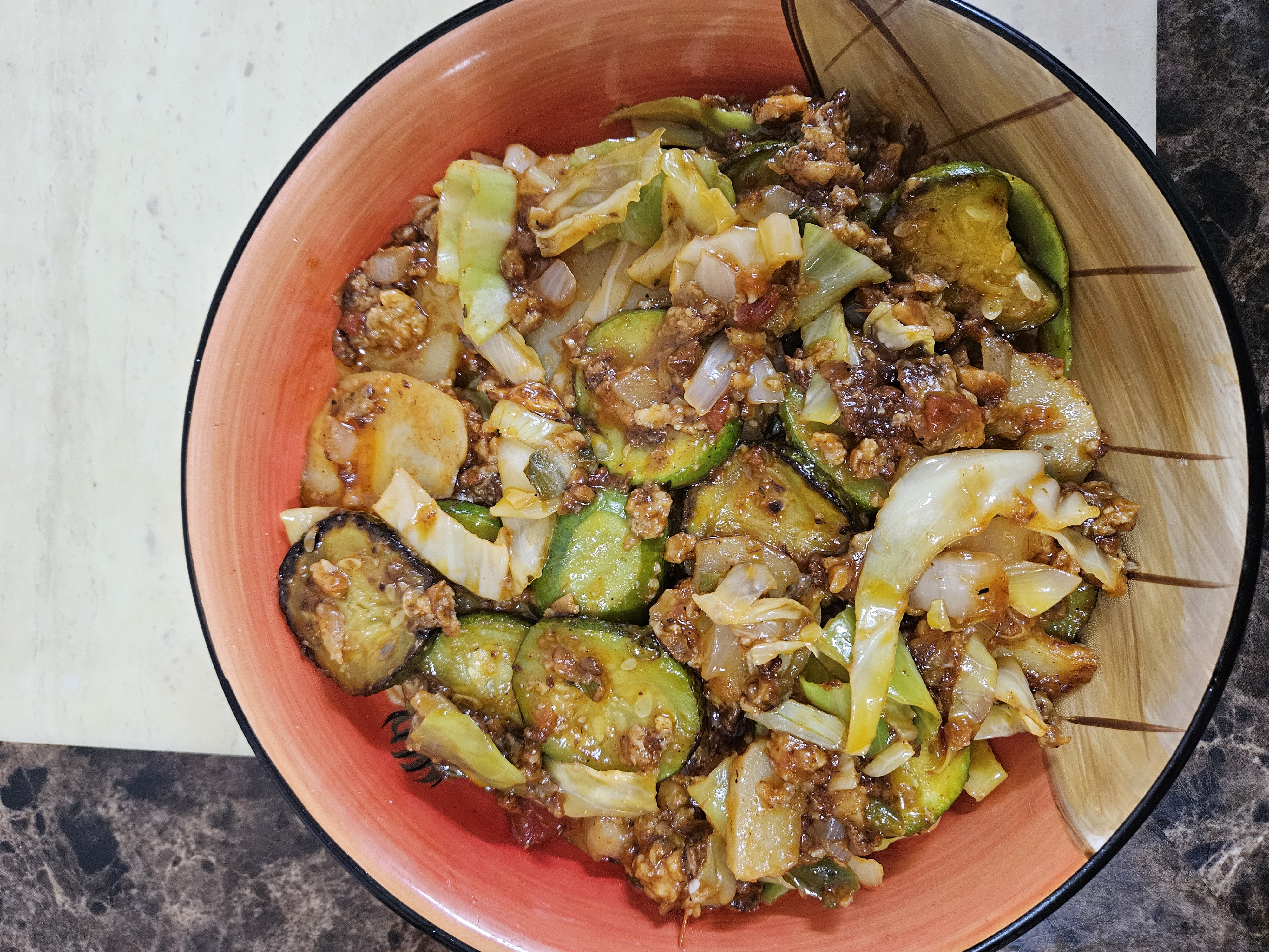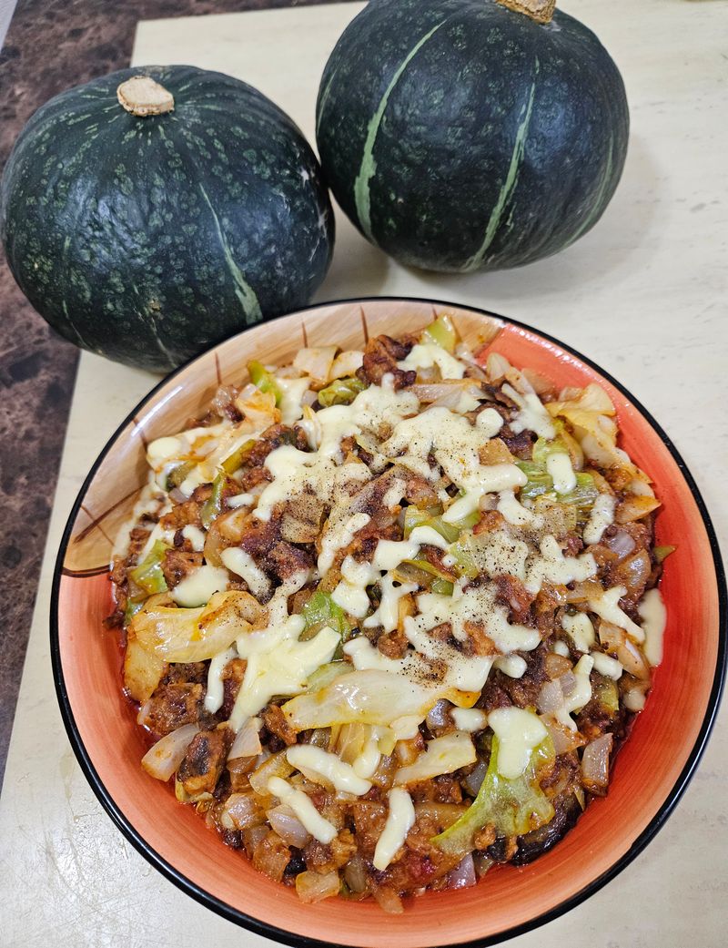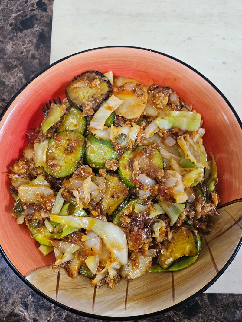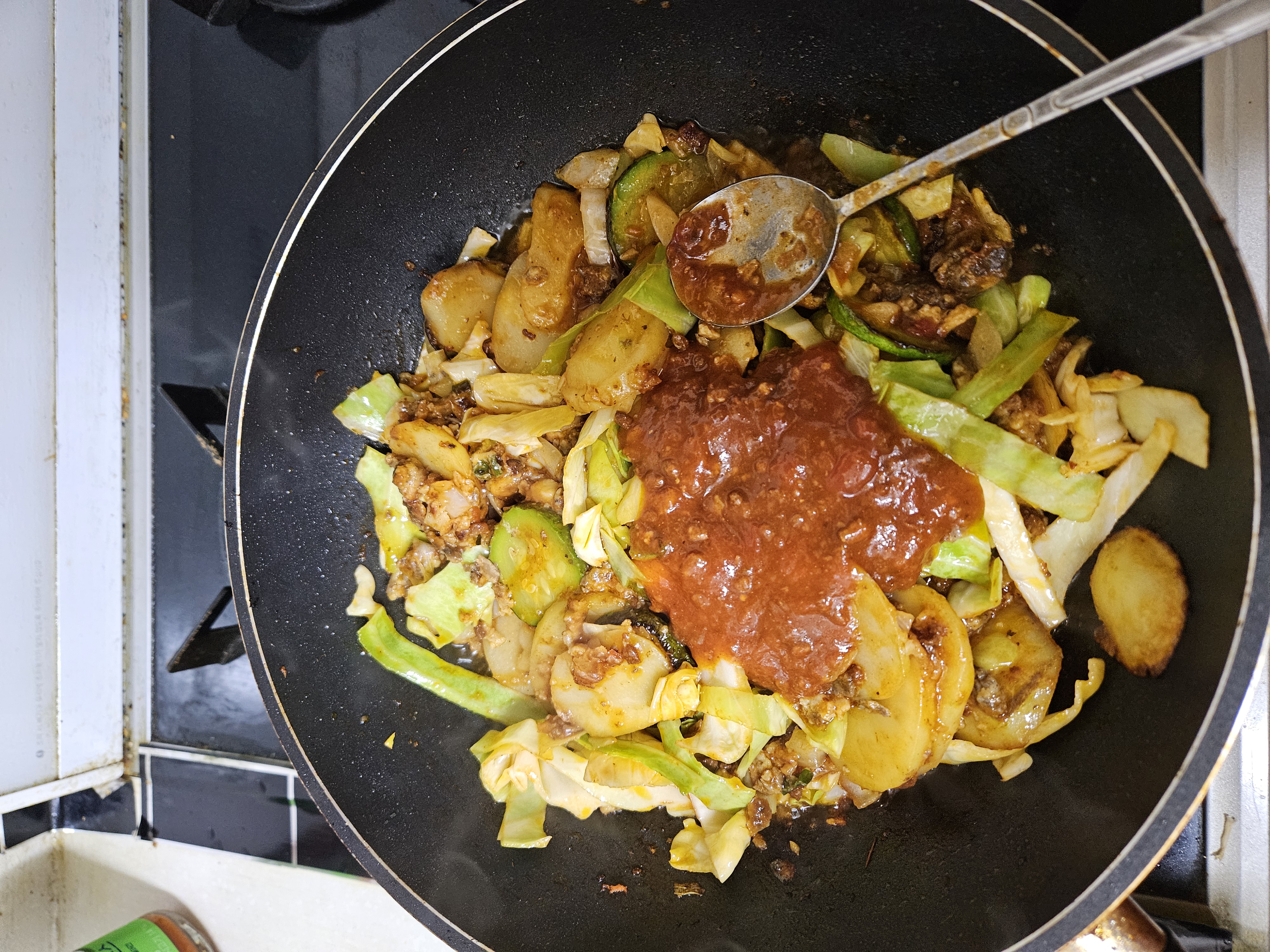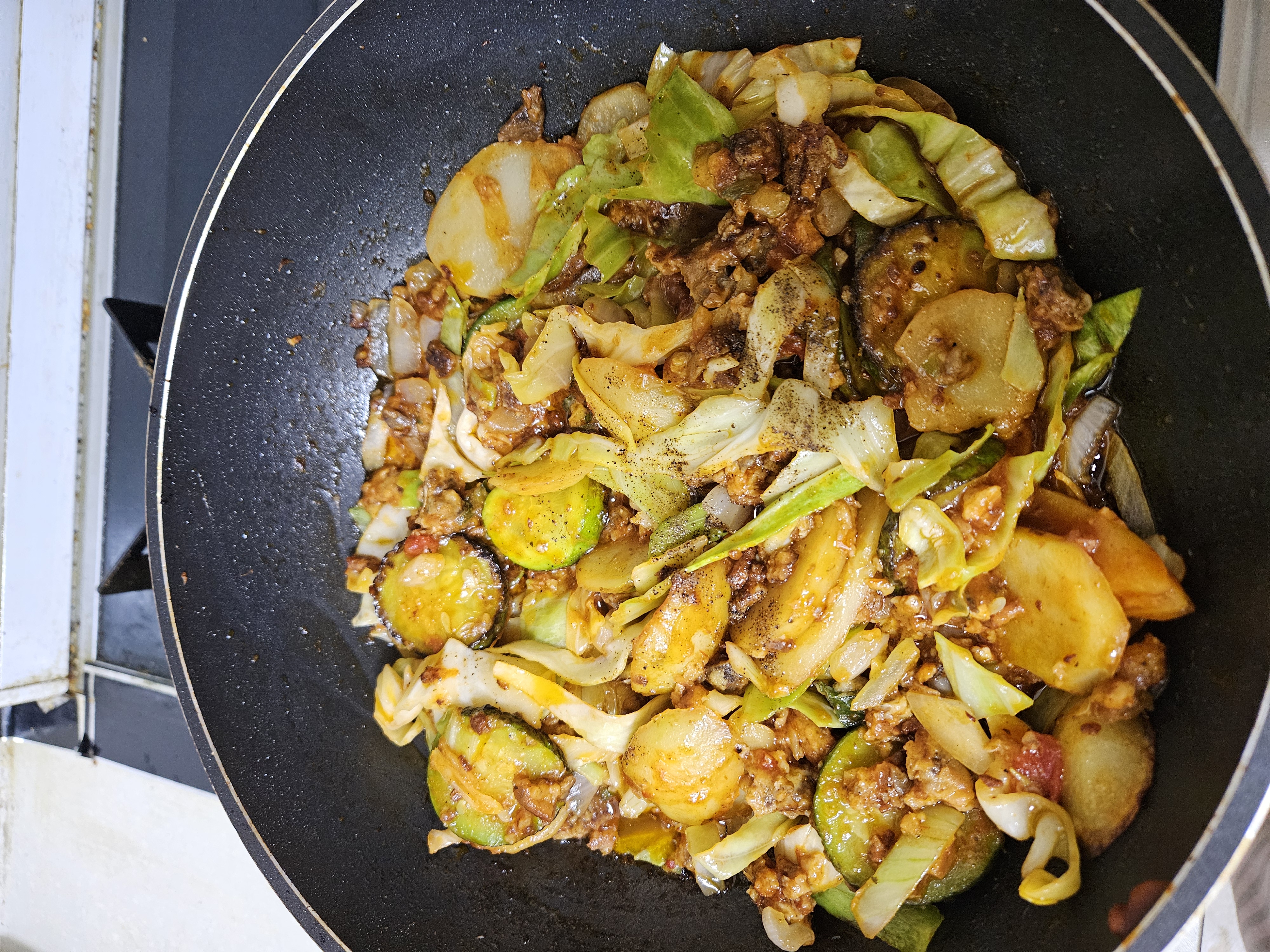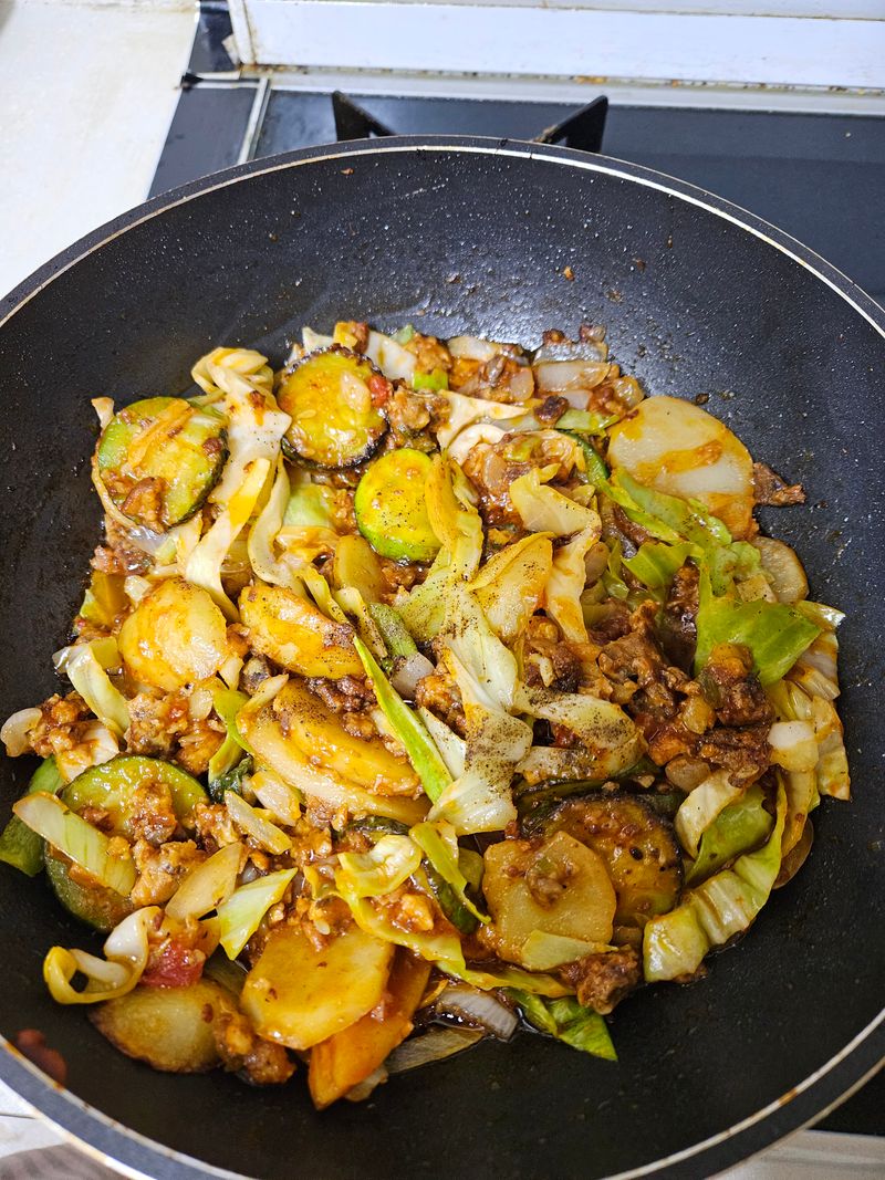 4. 감자와 애호박의 달큰한 향이 올라오면, 육전과 양파, 양배추를 넣고 볶아준다.