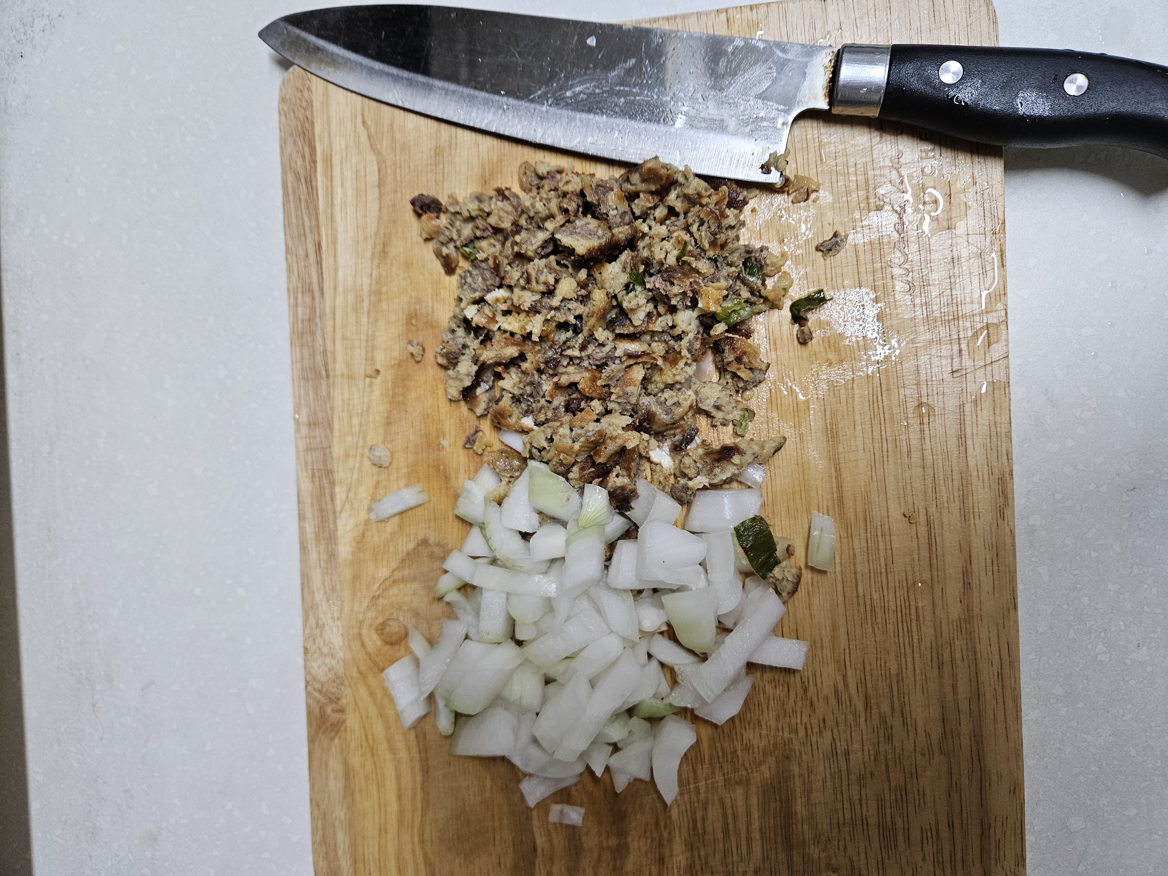 2. 양파는 깍둑썰기, 육전은 작게 다지듯 썰어준다. QICK!