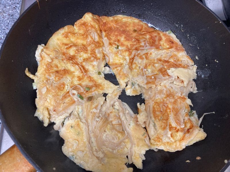 뒤집어야 하는게 잘 뒤집어 지지 않고 반으로 잡혀서 펼쳐서 익혔다