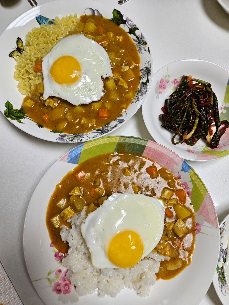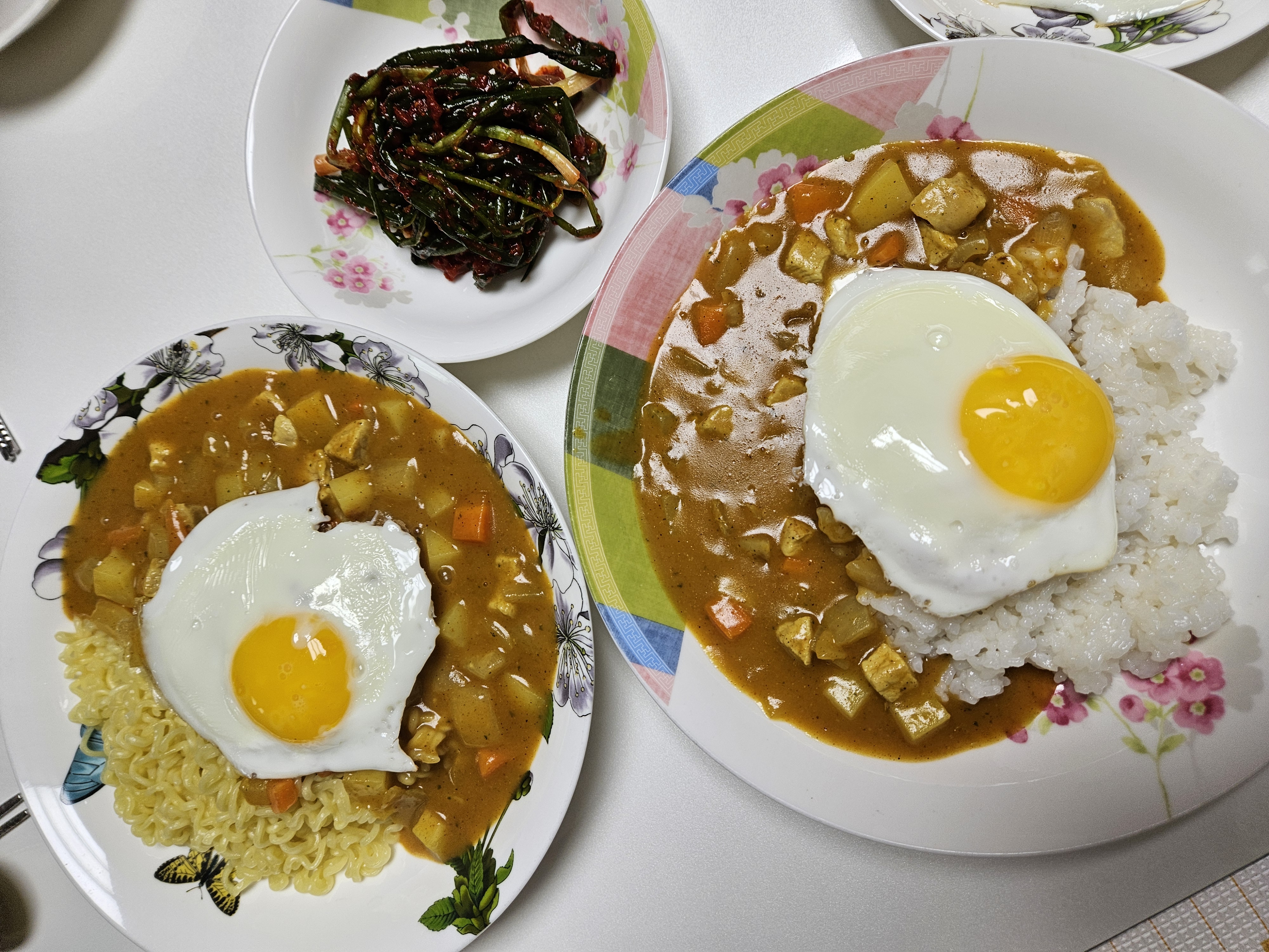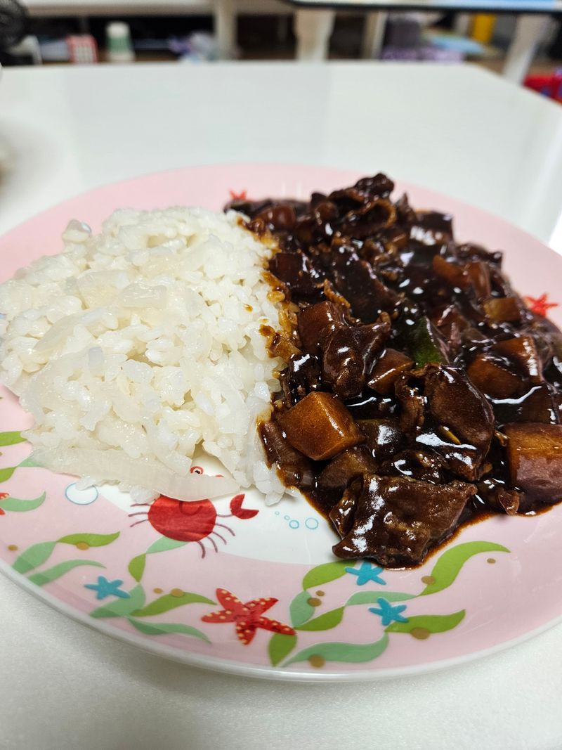 그래도 칼질은 (양파 빼고) 어느정도 자신은 있었는데, 무엇을 먼저 볶아야 하는지에서 뇌 정지가 오더라고요 ㅎㅎ 야채부터? 아님 고기부터? 카레 분말을 풀어넣고 끓여야 하는지, 아니면 먼저 끓인 후에 마지막에 넣어야 하는지 등 계속 검색, 확인하면서 만들었습니다. 주부 9년차가 물어보기엔 창피한 질문인데 덕분에 아주 맛있게 요리를 완성 했습니다! 딸도 너무 맛있다고 엄지척 해주고요! 딸의 요청대로 재료를 작게 썰어주니 양파도, 당근도 안가리고 잘 먹어줘서 고맙더라고요.
