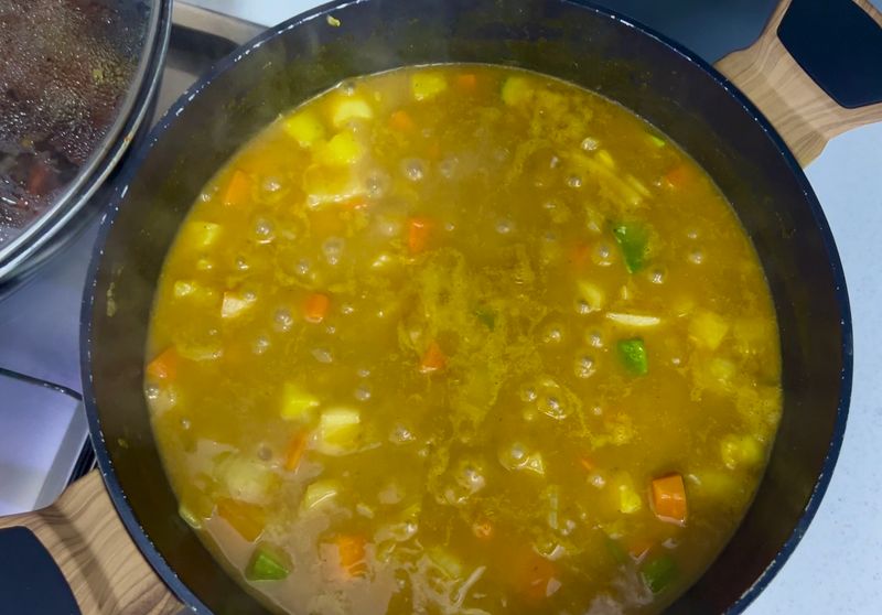 커리는 설명서에 적혀 있는대로 물 600ml 와 함께 섞어서 끓였더니 간이 딱! 맞았습니다.