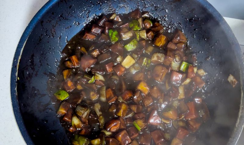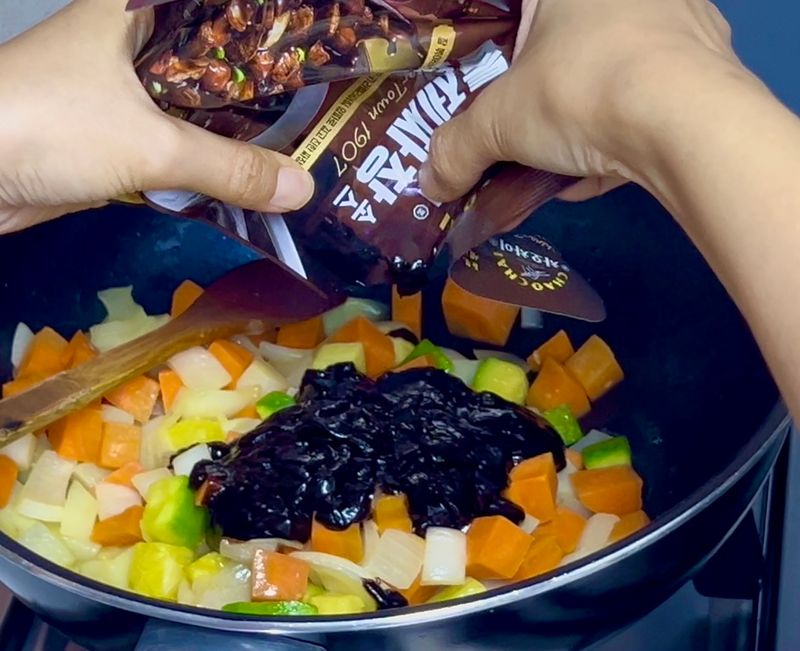 짜장은 재료 위에 짜장 소스를 바로 부어서 섞어가며 익혀주었어요.