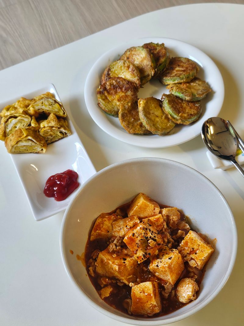 그냥 먹기는 아쉬워서 애호박으로 전도 부치고, 남은 계란물로 계란말이까지 만드니 풍성한 한 상이 차려졌어요!! 그래도 역시나 마파두부가 제일 맛있었습니다ㅎㅎ