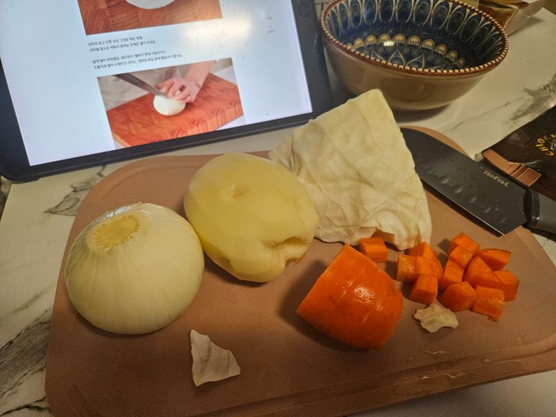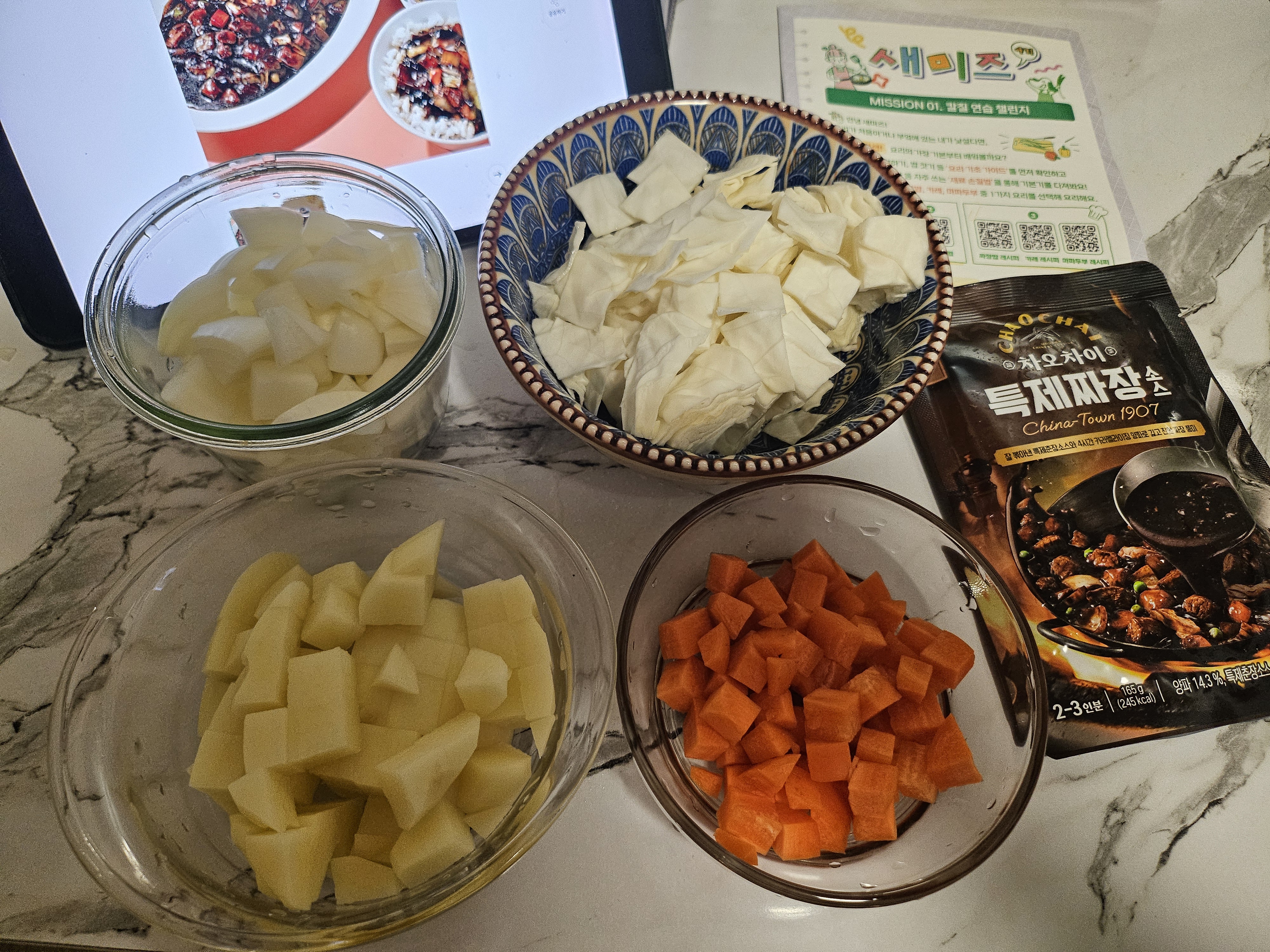 짜장을 만들기 위해 양파, 당근, 감자, 양배추를 손질했는데, 4가지 재료 모두 상세히 안내된 방법 그대로 따라 하기만 하면 끝나서 너무 놀랐습니다. 새미즈 덕분에 효율적으로 요리하면서 주방에 대한 두려움도 점점 사라지고, 요리가 즐겁게 느껴졌습니다!🫶