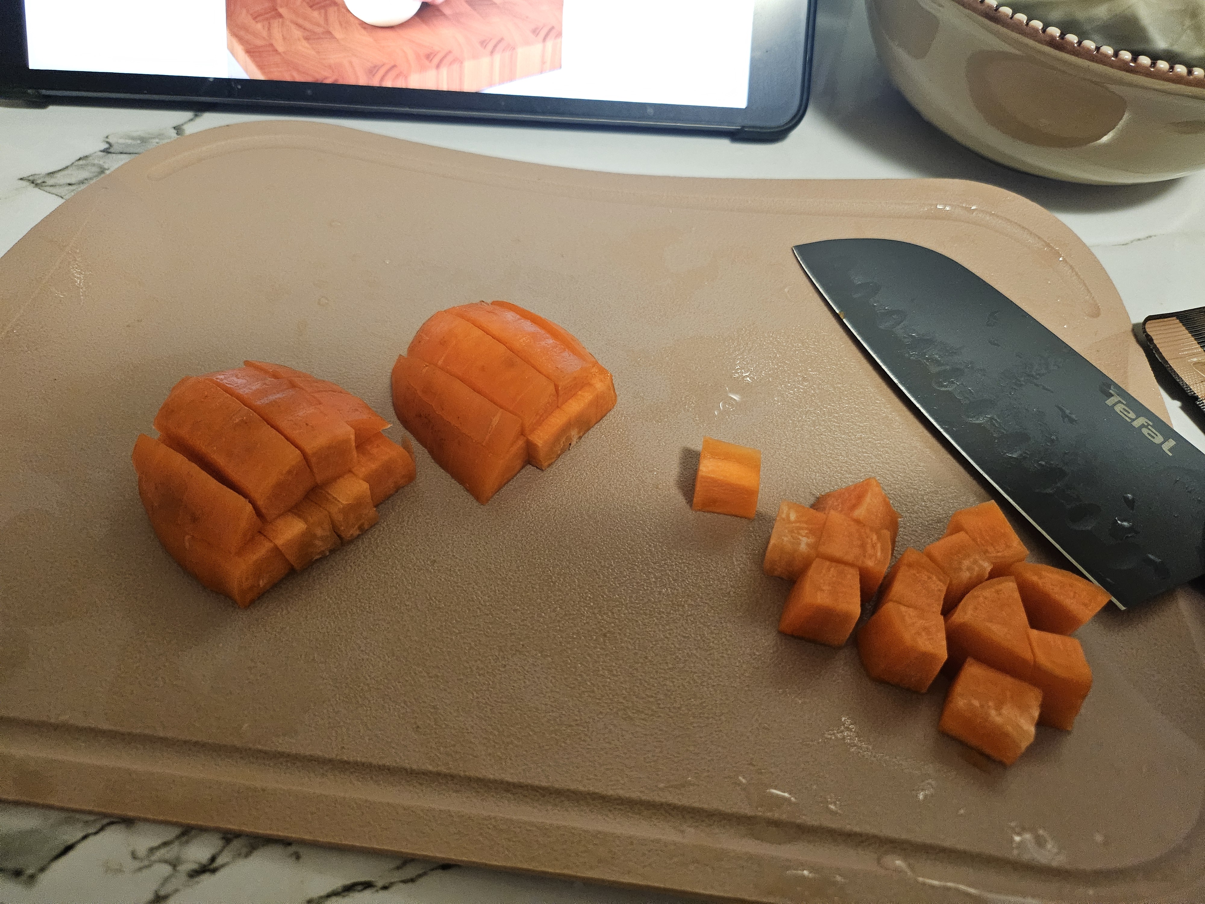 근데 처음으로 칼질 연습 챌린지를 하면서 주방에서 즐거움을 느낄 수 있었습니다. 칼을 잡는 방법이 있다는 것도 처음 알았는데, QR코드에 안내된대로 칼과 손잡이 사이를 잡고 자르니 손목이 아프지도 않고 정확도도 올라 너무 쉽게 뚝딱 재료 손질을 할 수 있었습니다. 하다 보니 다른 재료도 마구 자르고 싶어졌지만 겨우 참았습니다.ㅎㅎ🔪